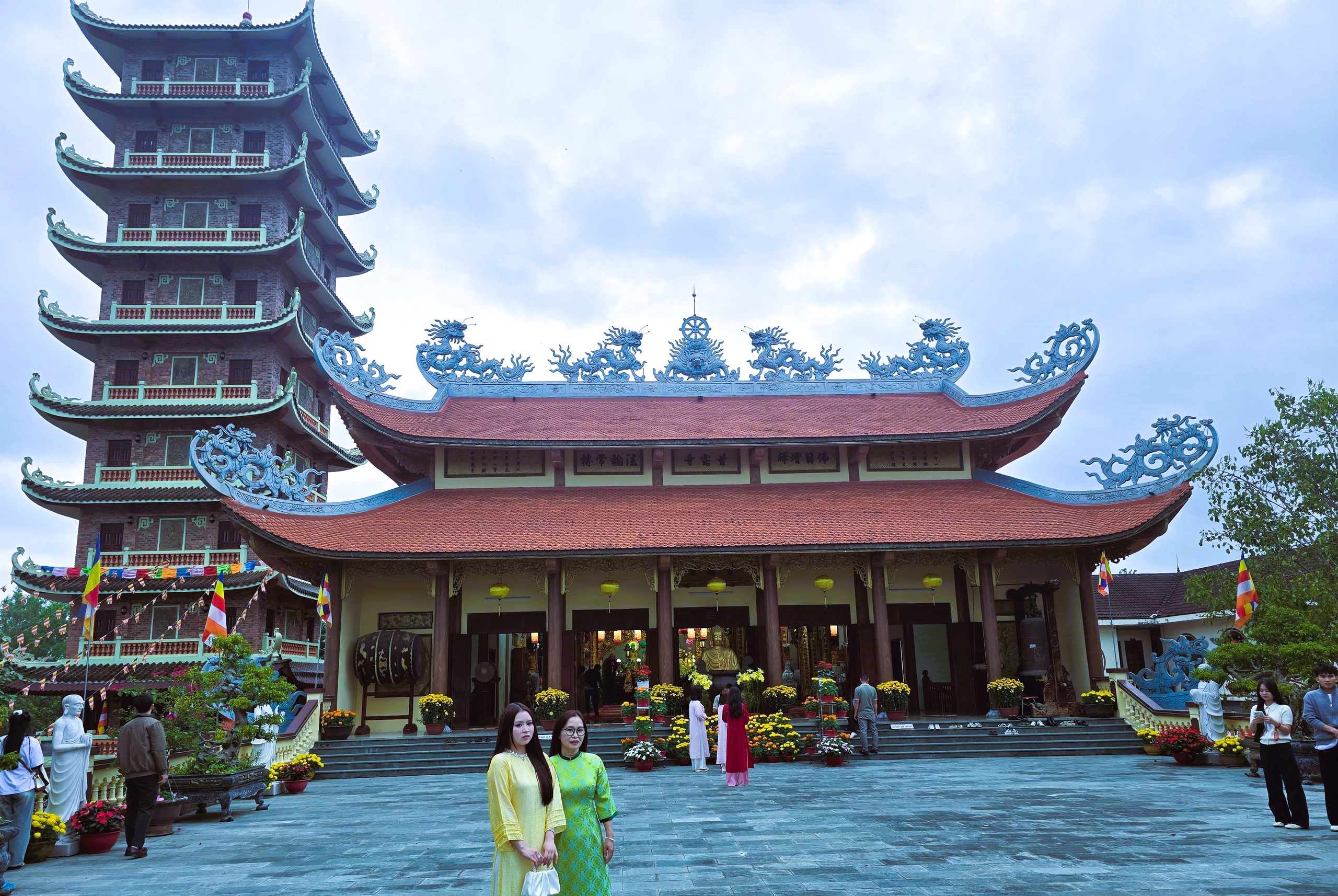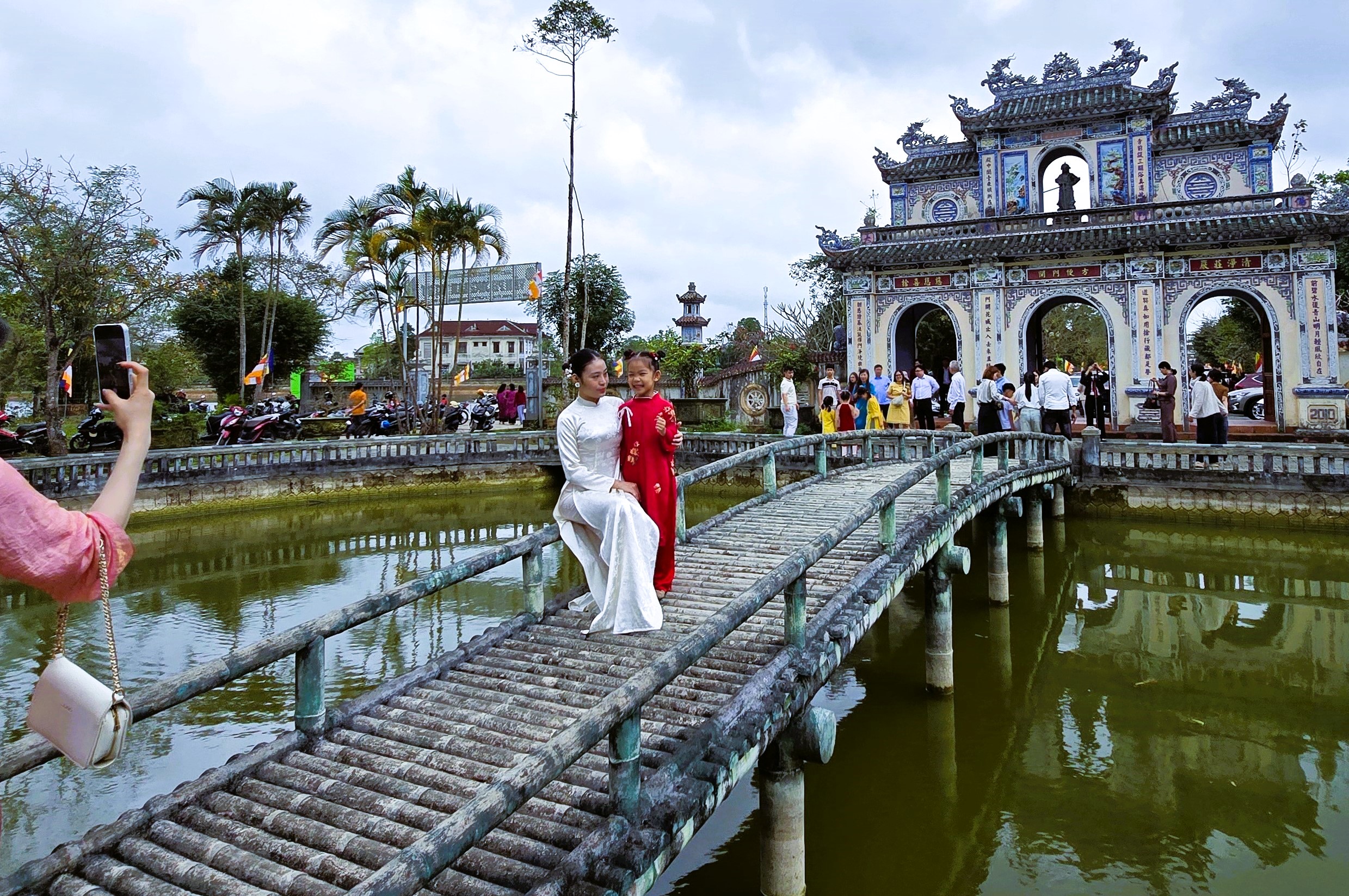 Người dân tranh thủ “check in” tại chùa Cam Lộ.