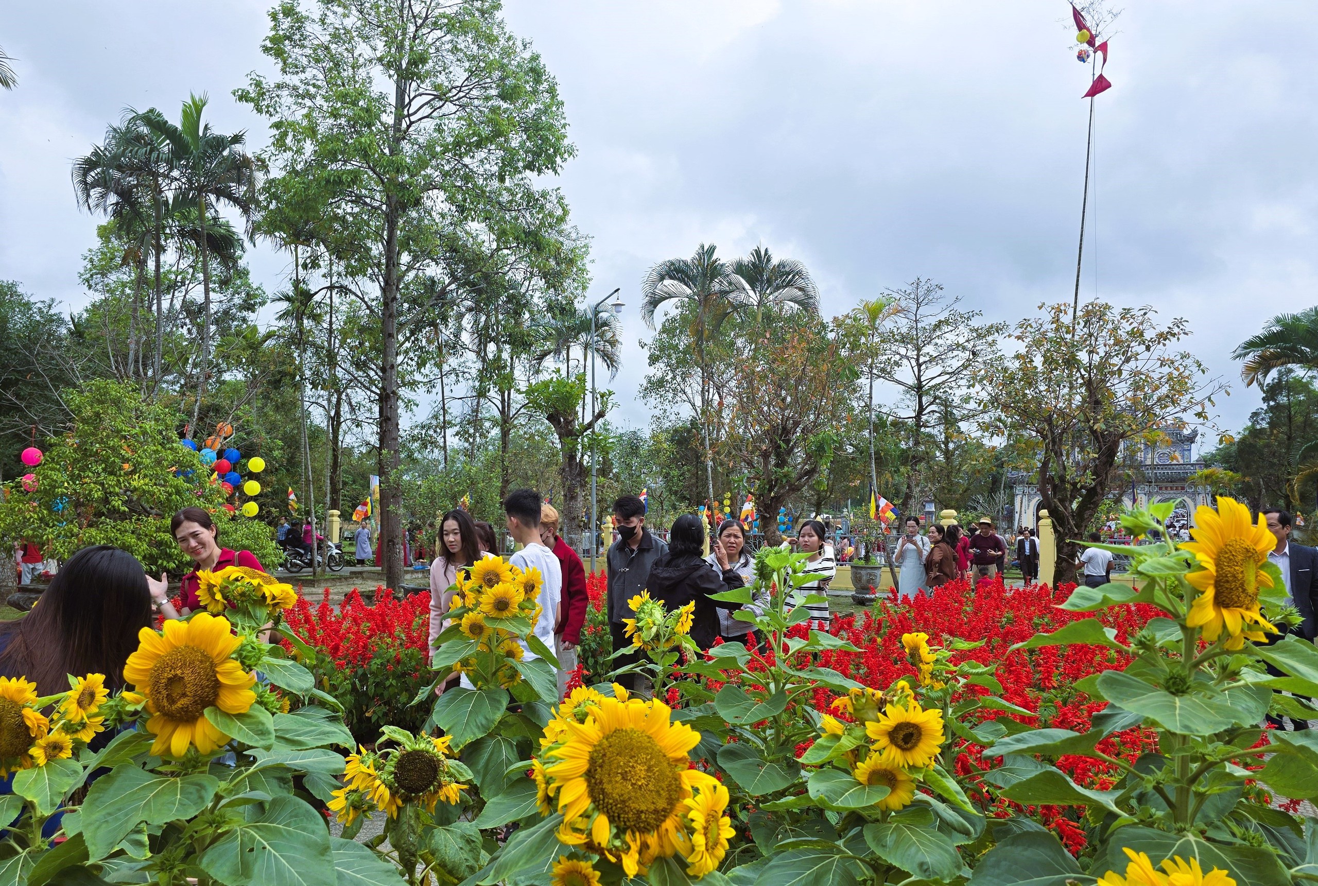 Bên vườn hoa rực rỡ sắc Xuân và cây nêu ngày Tết trước cổng chính vào chùa Sắc Tứ Tịnh Quang.