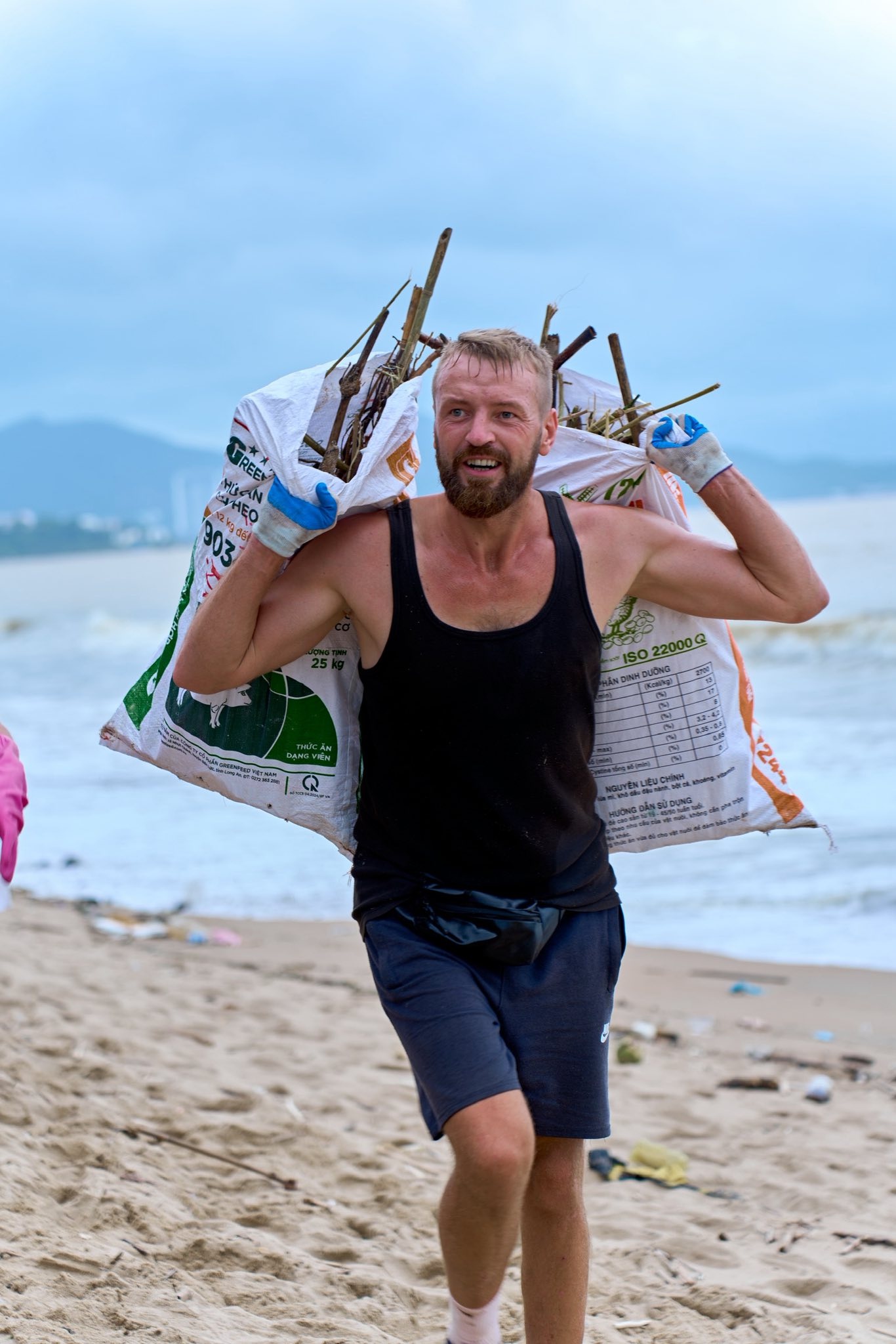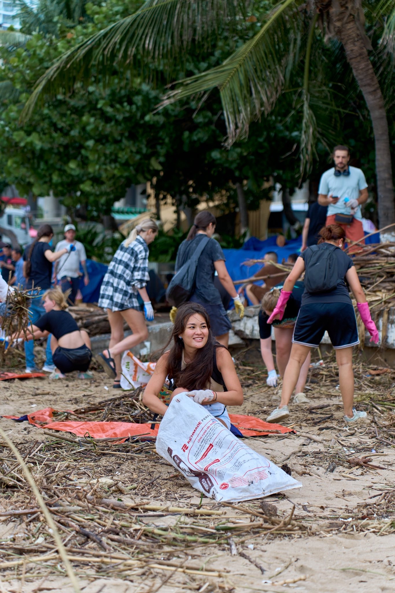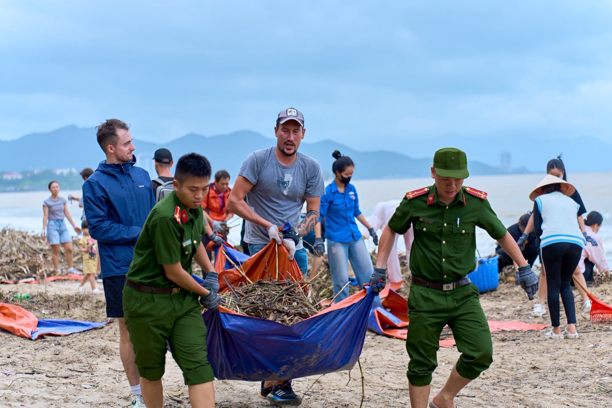 Du khách hỗ trợ người dân, lực lượng chức năng dọn dẹp bãi biển Nha Trang. Hiện tại, khu vực bãi tắm gần tháp Trầm Hương, đường Trần Phú đã sạch sẽ trở lại. Hình ảnh chụp 9h sáng 24/11. Ảnh: Quân Nguyễn.