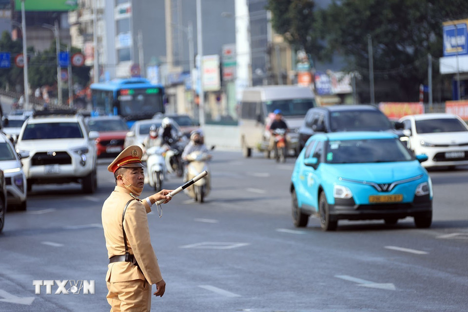 Lực lượng cảnh sát giao thông phân luồng các phương tiện lối xuống cầu Vĩnh Tuy đi Long Biên. (Ảnh: Tuấn Anh/TTXVN)