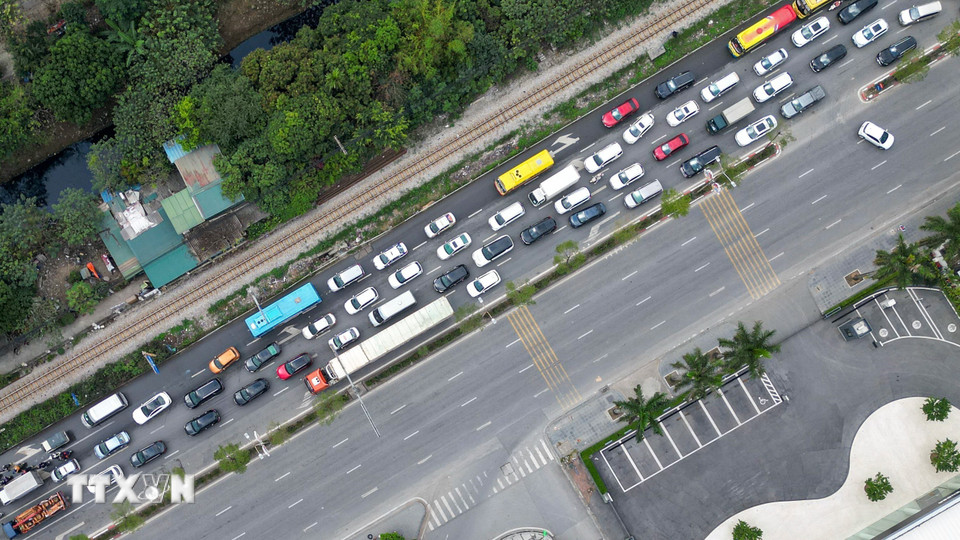 Tình trạng ùn tắc cục bộ hướng ra ngoại thành tại nút giao thông đầu cầu Vĩnh Tuy hướng ra đường Cổ Linh. (Ảnh: Minh Quyết/TTXVN)