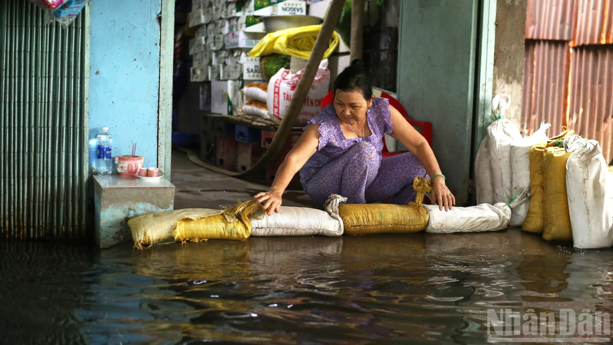 Người dân sinh sống ở một đoạn đường Phú Định (cạnh công trường cống ngăn triều Phú Định) phải dùng bao cát đắp vách ngăn để chống ngập.