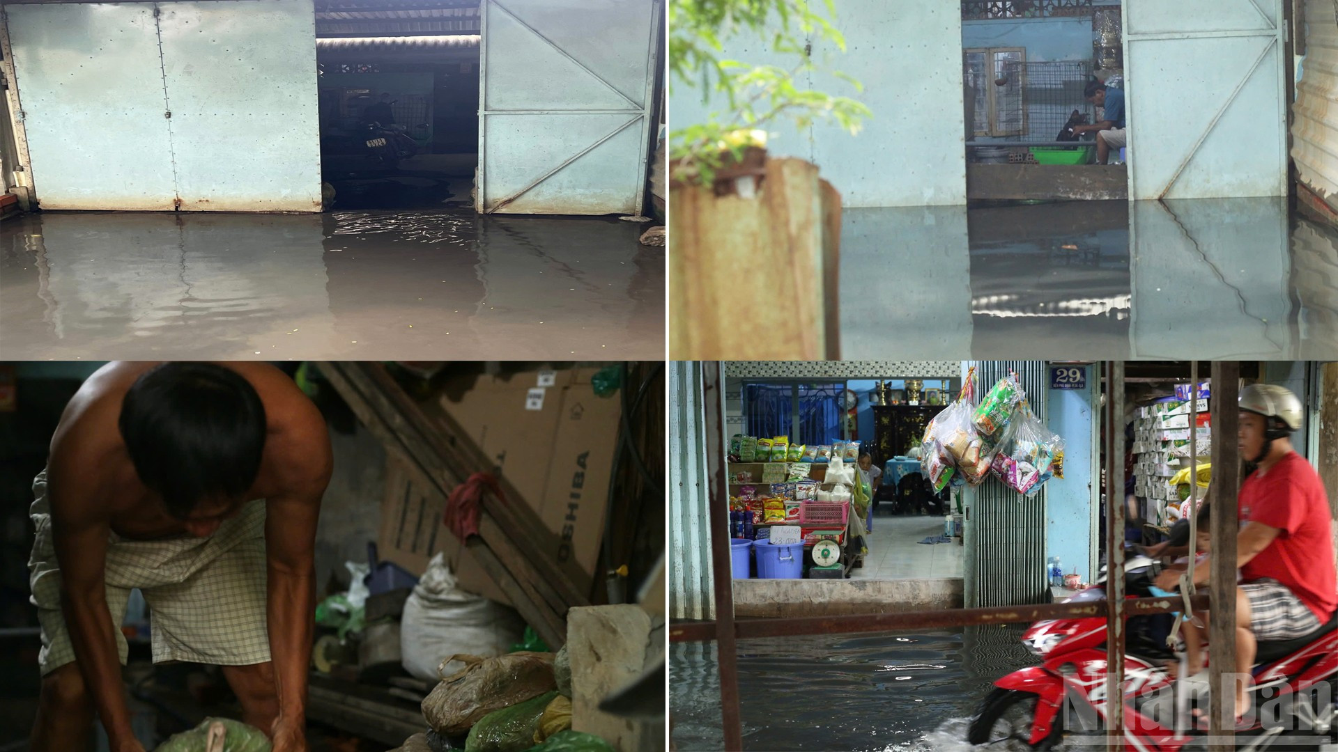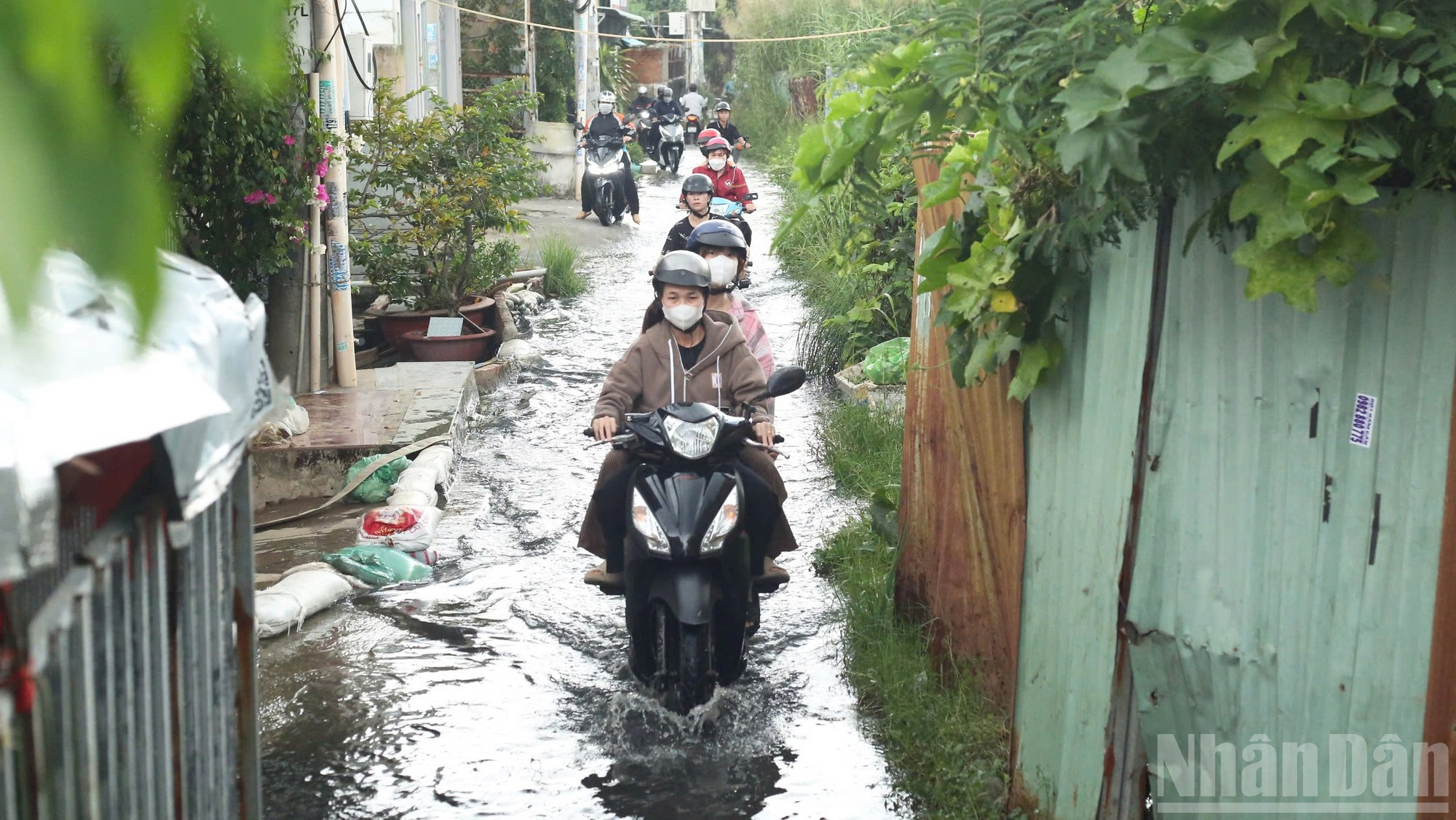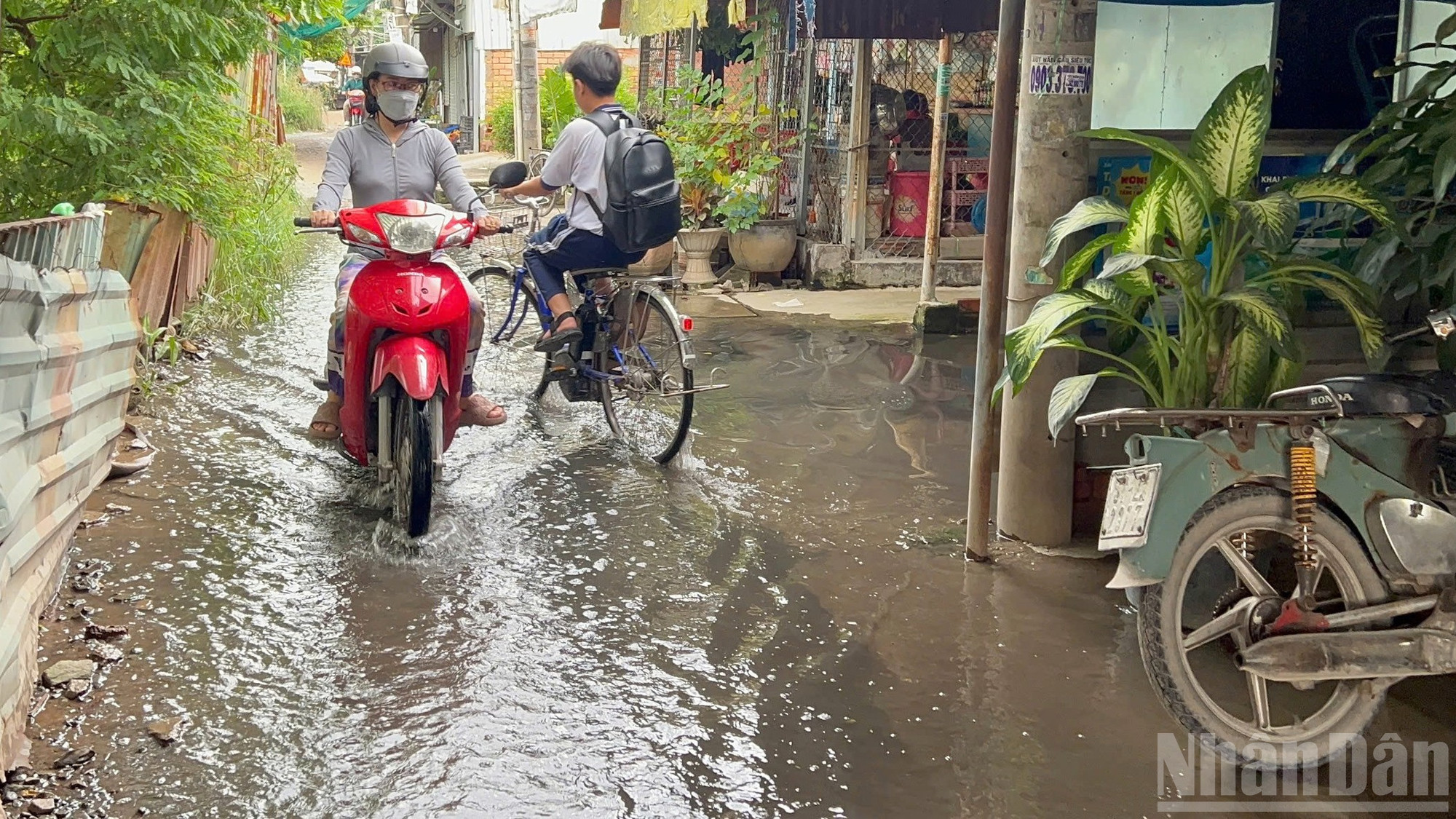 Theo ghi nhận của phóng viên vào những ngày này, dự báo triều cường dâng cao sẽ khiến con đường nhỏ ven kênh Đôi bị ngập nặng, biến thành một dòng sông nước đục ngầu. Nước tràn lênh láng vào nhà dân, mực nước dâng cao hơn 0,4m, ngập quá nửa bánh xe máy..