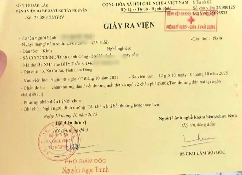 Bác sĩ chẩn đoán anh Đ chấn thương đầu, mất đoạn xa ngón hai chân phải, dập nát ngón chân, chấn thương đầu. Đến ngày 10-10, anh Đ được cho xuất viện. Khi xuất viện, bệnh viện không kê đơn thuốc cho anh.