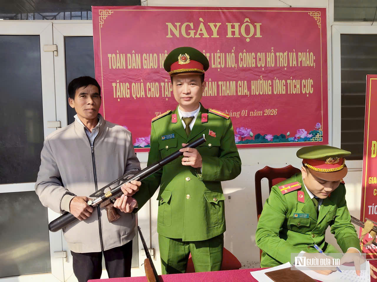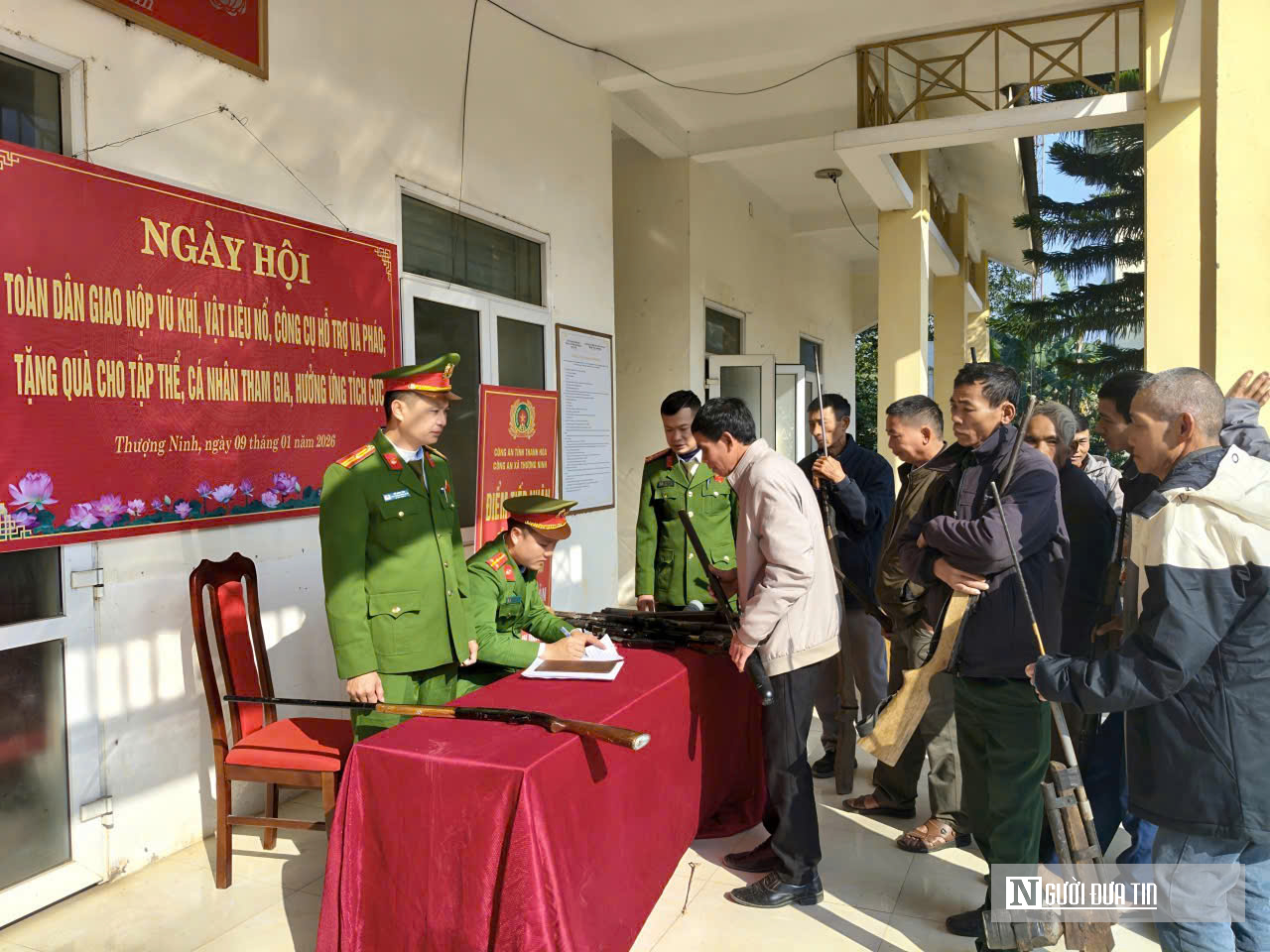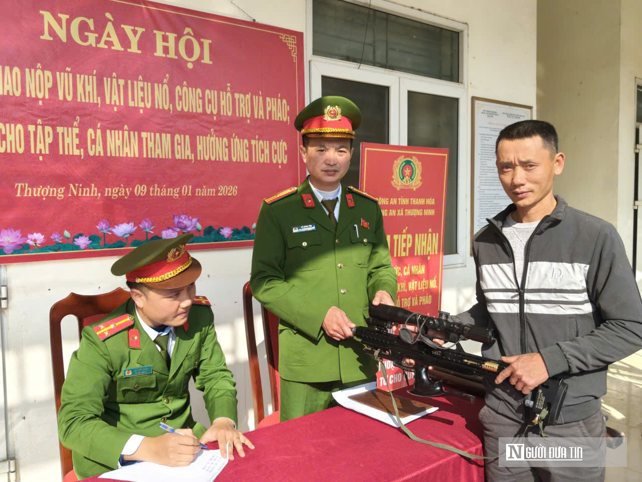Chiều 9/1, ghi nhận của phóng viên tại trụ sở Công an xã Thượng Ninh (Thanh Hóa), không khí khá nhộn nhịp khi người dân các thôn lần lượt mang theo súng săn, nỏ, dao, kiếm… đến giao nộp cho lực lượng chức năng. Sau khi tiếp nhận, công an xã lập biên bản, phân loại, quản lý vũ khí theo đúng quy định.
