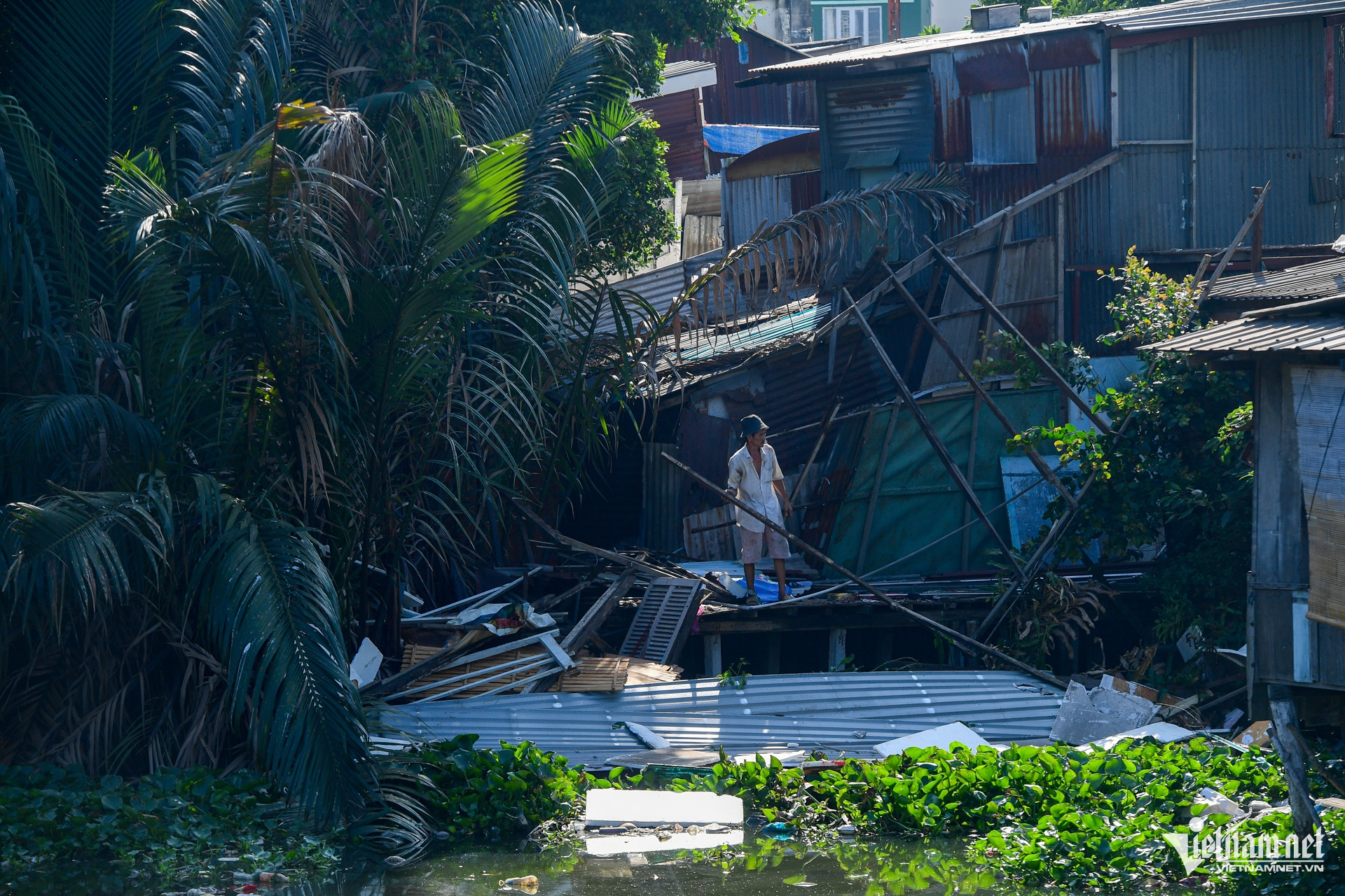 Ông Phạm Văn Cường, người thân của anh Ngân, đang tháo dỡ phần đuôi nhà lấn chiếm lòng kênh. Do diện tích sinh hoạt hạn chế, trước đây nhiều hộ dân đã dựng cọc, cơi nới nhà sàn ra phía lòng rạch.