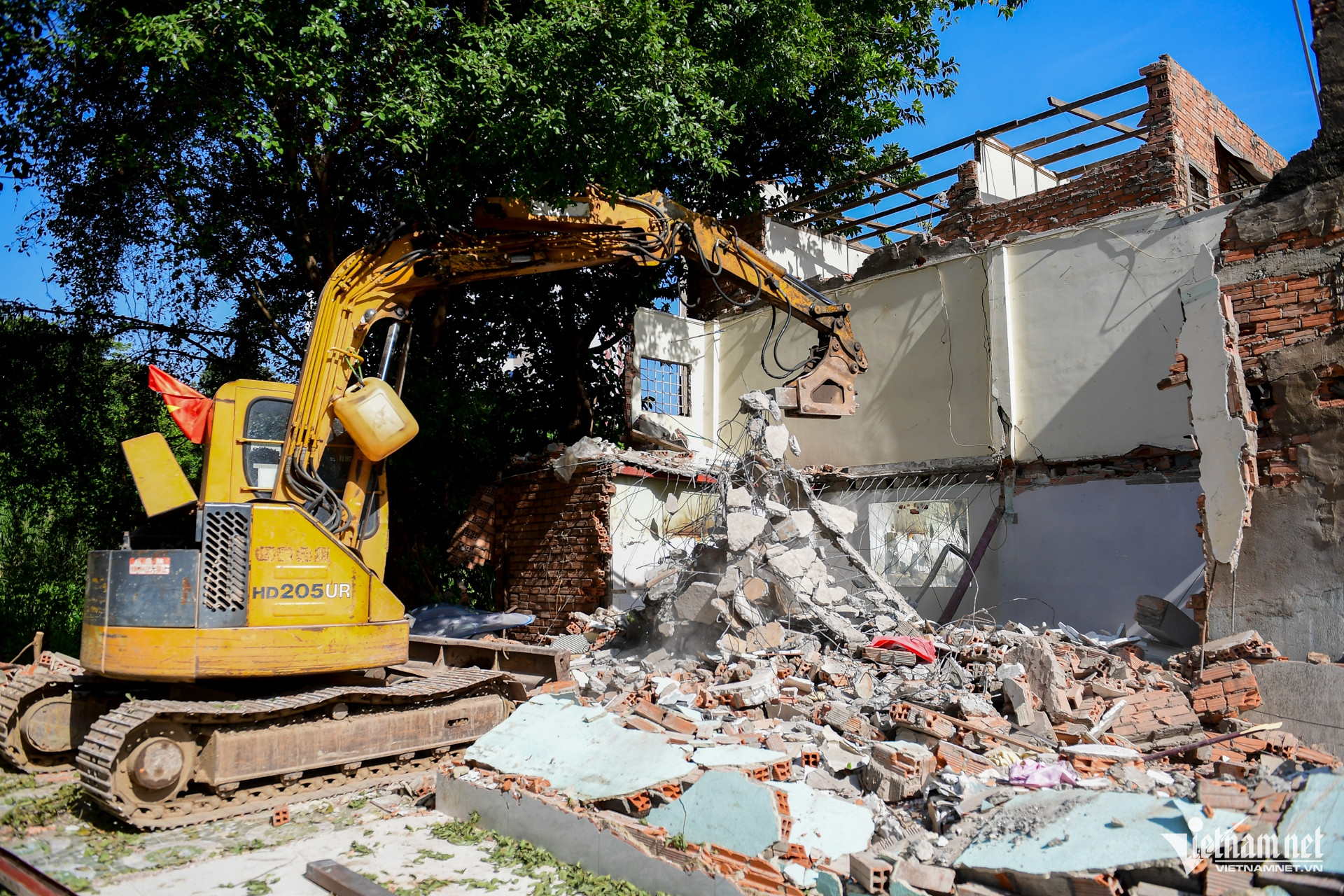 Cách đó khoảng 500m, một nhóm công nhân đang tháo dỡ hai căn nhà liền kề với diện tích hơn 100m². Sau khi thu dọn vật dụng và tháo rời các hạng mục còn sử dụng được, lực lượng thi công tiến hành tháo dỡ thủ công phần mái, vách, trước khi sử dụng máy xúc phá dỡ kết cấu chính, thu gom xà bần và bàn giao mặt bằng.