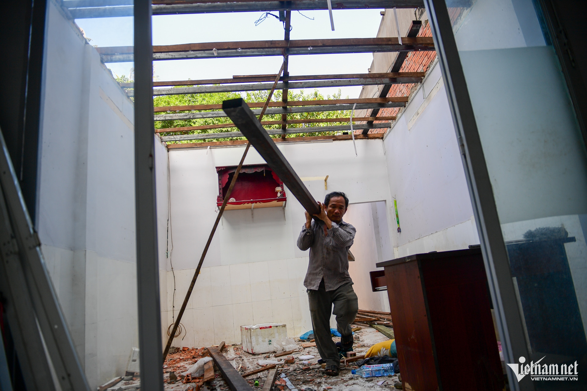 Anh Trần Khánh Ngân (43 tuổi) cùng người nhà đang tháo dỡ các khung cửa sắt còn sử dụng được tại căn nhà số 153/150. Theo anh Ngân, công việc này dự kiến kéo dài khoảng ba ngày, sau đó gia đình sẽ thuê máy xúc phá dỡ phần tường còn lại để bàn giao mặt bằng cho dự án.