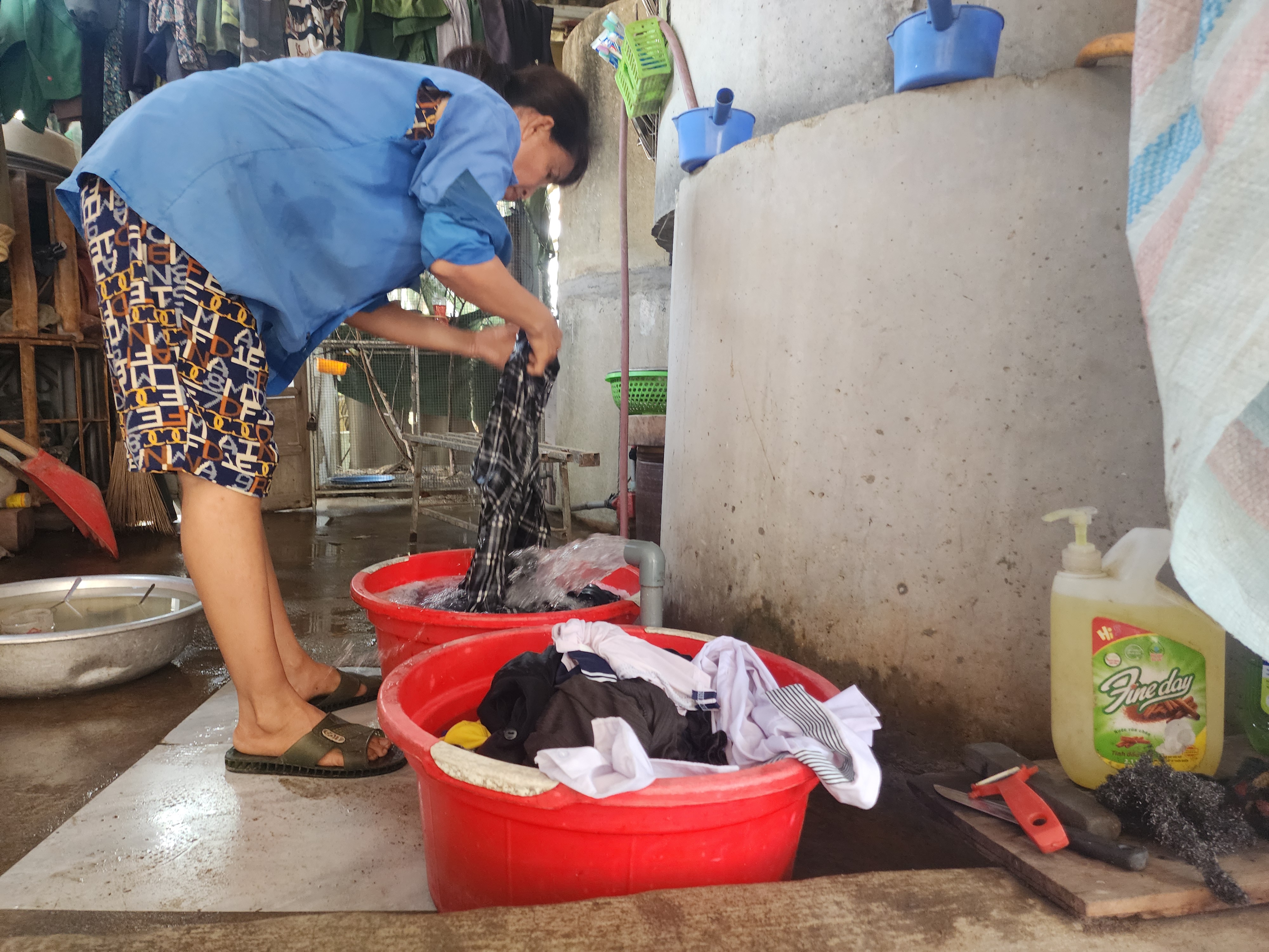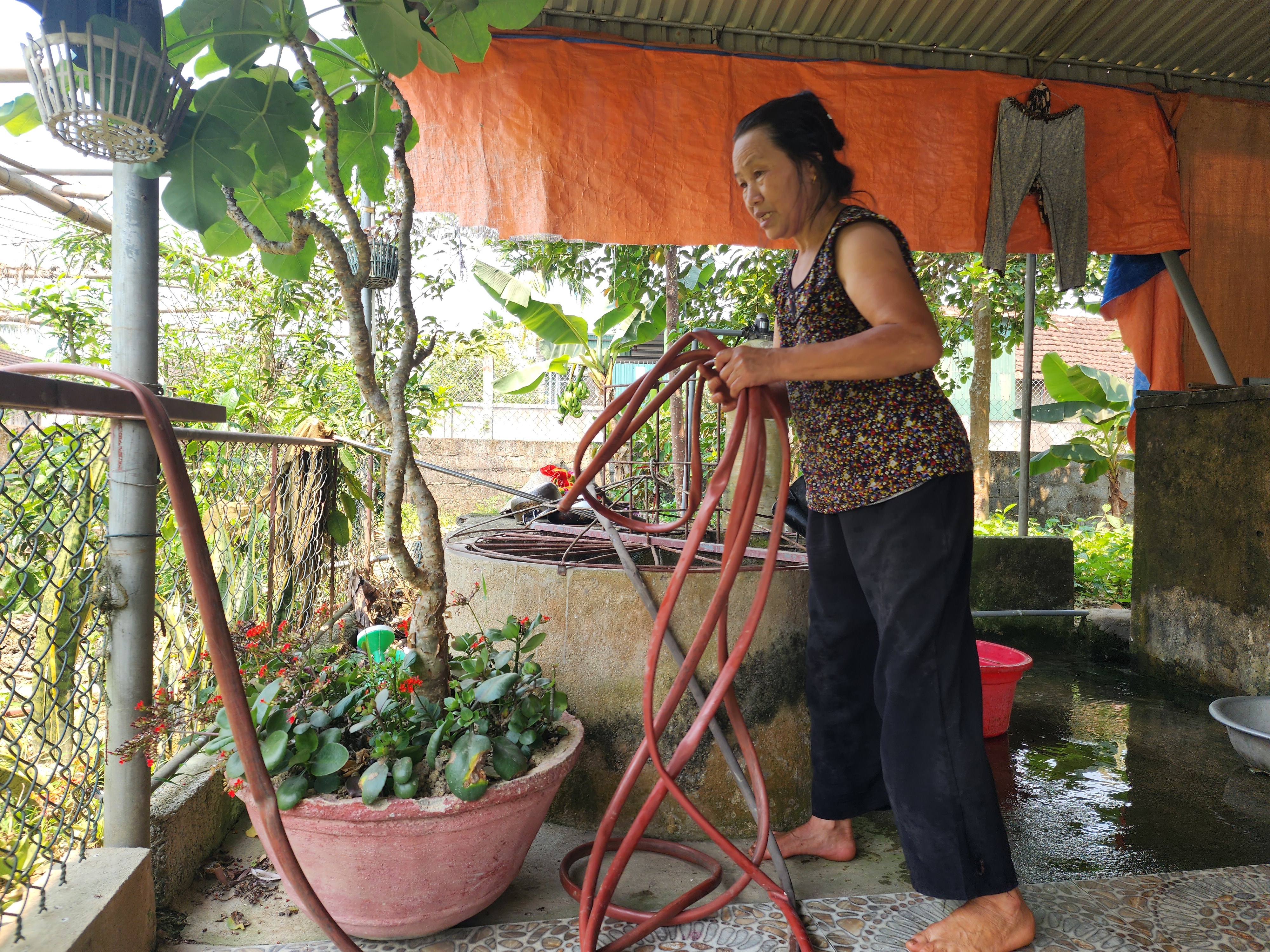 Cuộc sống của gia đình bà Nguyễn Thị Định (76 tuổi) cũng đảo lộn do không có nước máy sinh hoạt kéo dài. Gia đình phải sử dụng nước mưa tích trữ để ăn uống, song cũng đang cạn kiệt. Còn tắm rửa, giặt giũ quần áo thì sử dụng nước bơm từ hồ ngoài ruộng và giếng khơi.