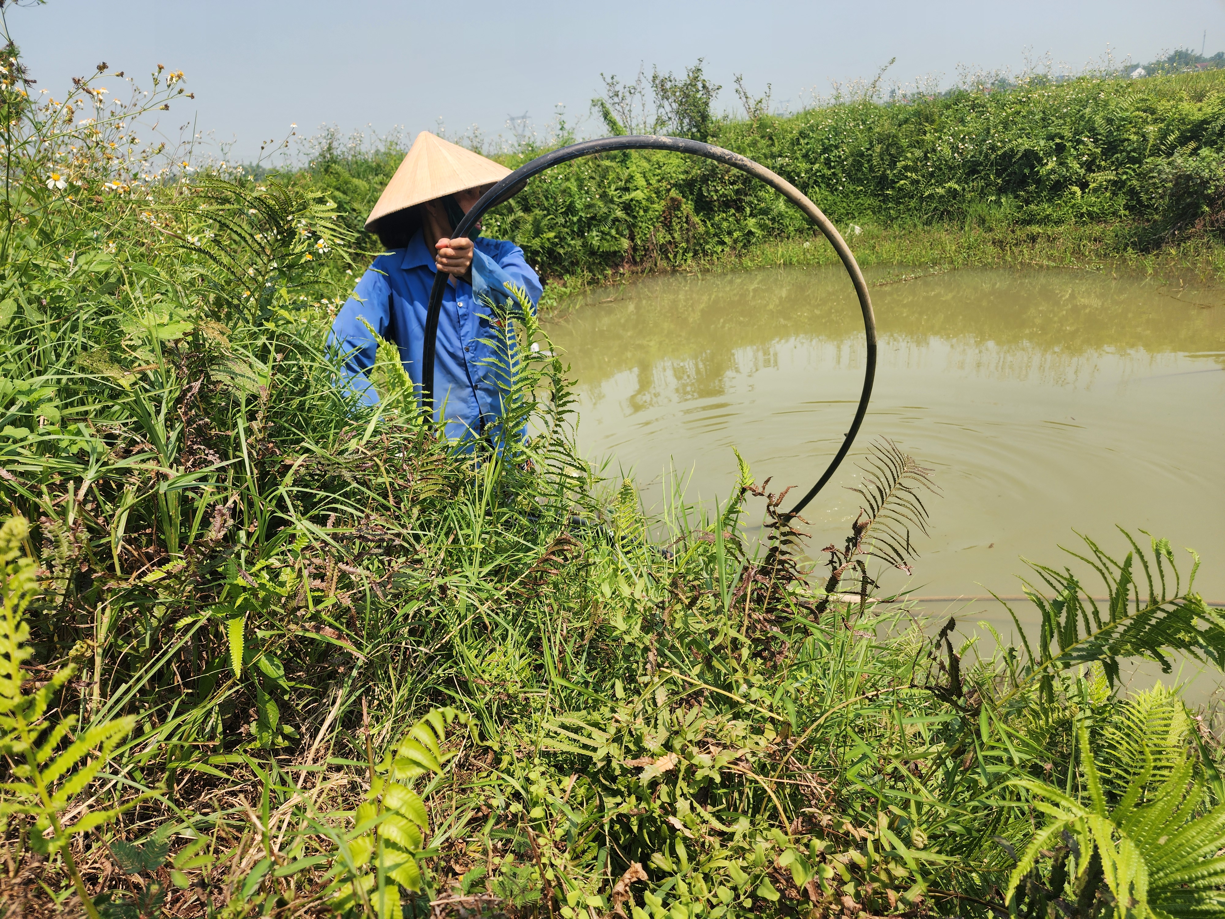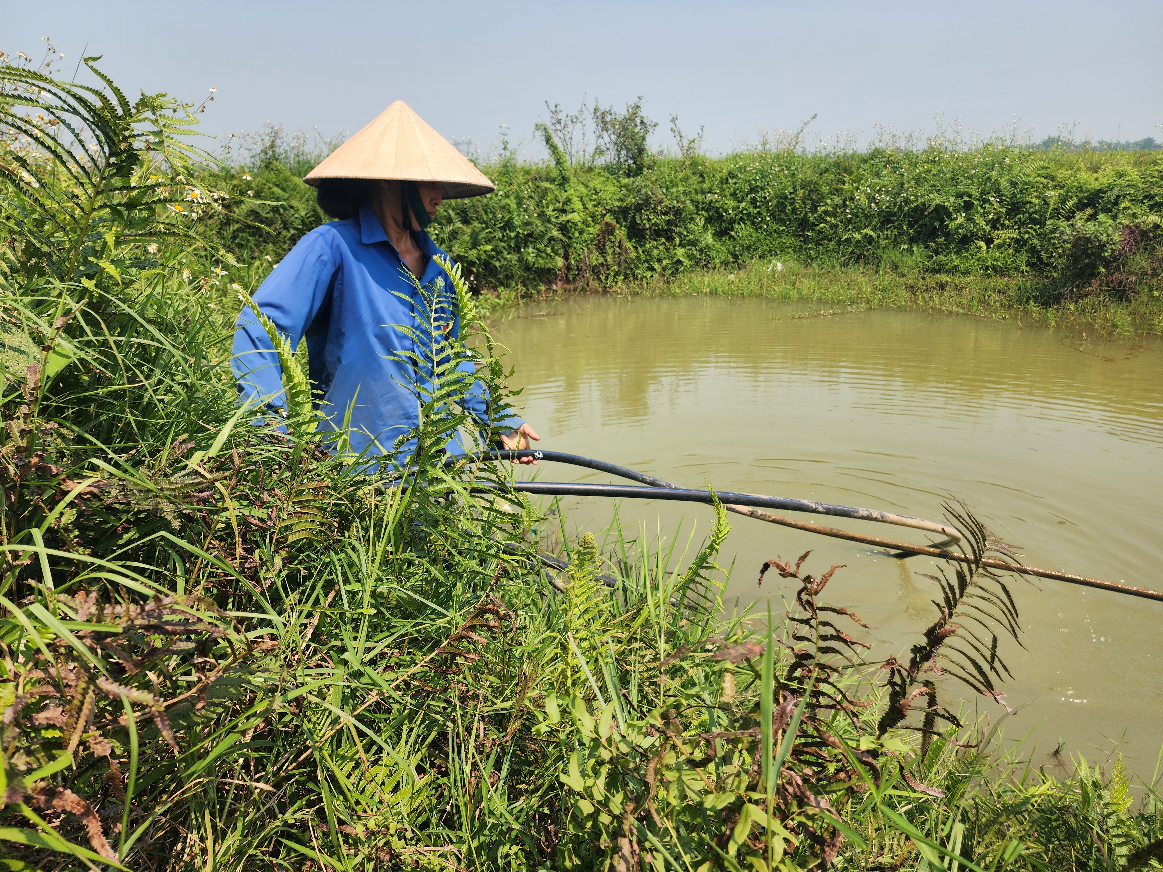 Chị Nguyễn Thị Thủy sử dụng ống và bơm nước hồ về sinh hoạt