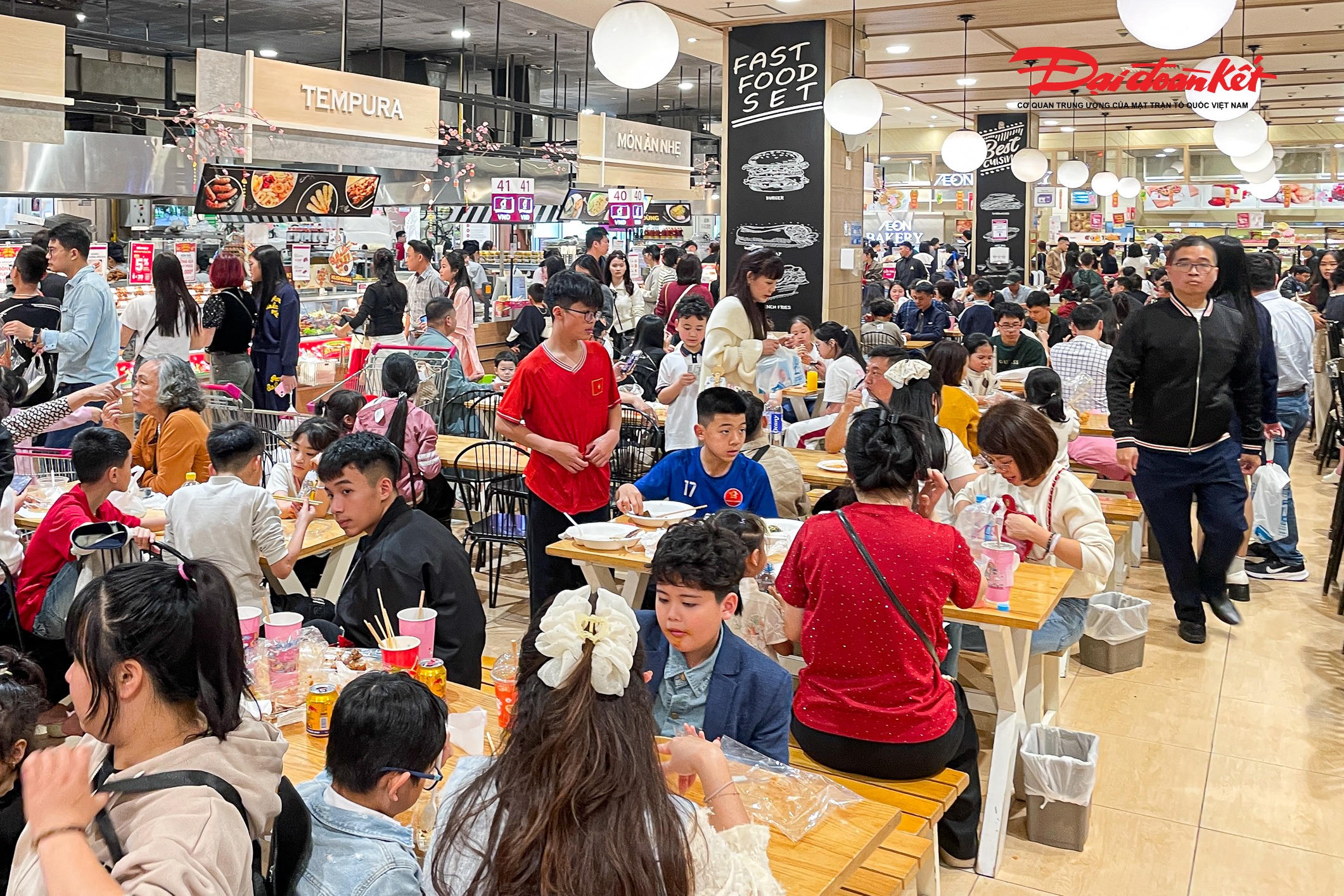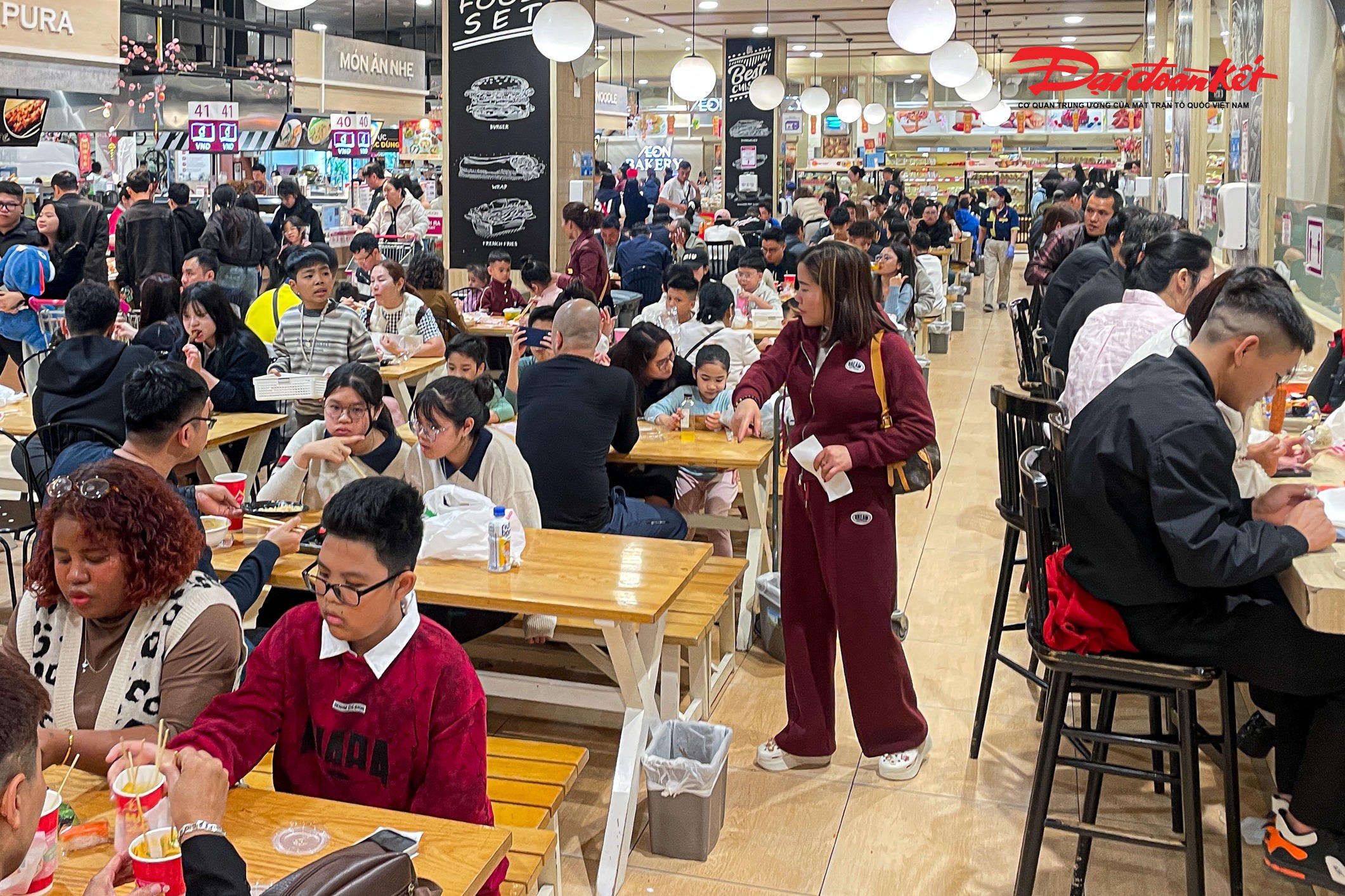 Bên trong khu ẩm thực, hầu hết các quầy hàng đều không còn chỗ trống, khách ngồi kín các dãy bàn từ trong ra ngoài. Vào giờ cao điểm, nhiều gia đình phải xếp hàng chờ đến lượt, tạo nên khung cảnh đông đúc, nhộn nhịp đặc trưng những ngày Tết.