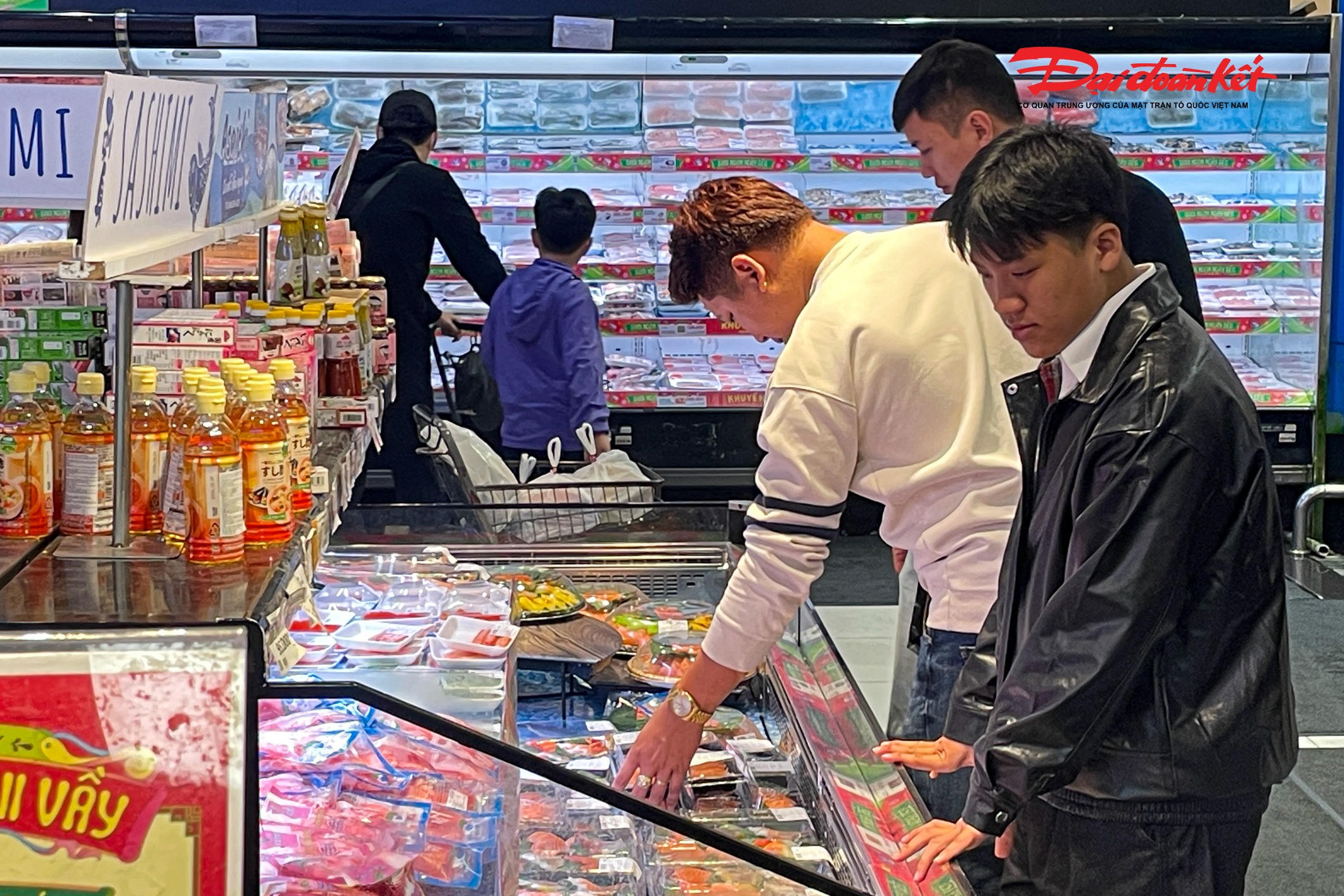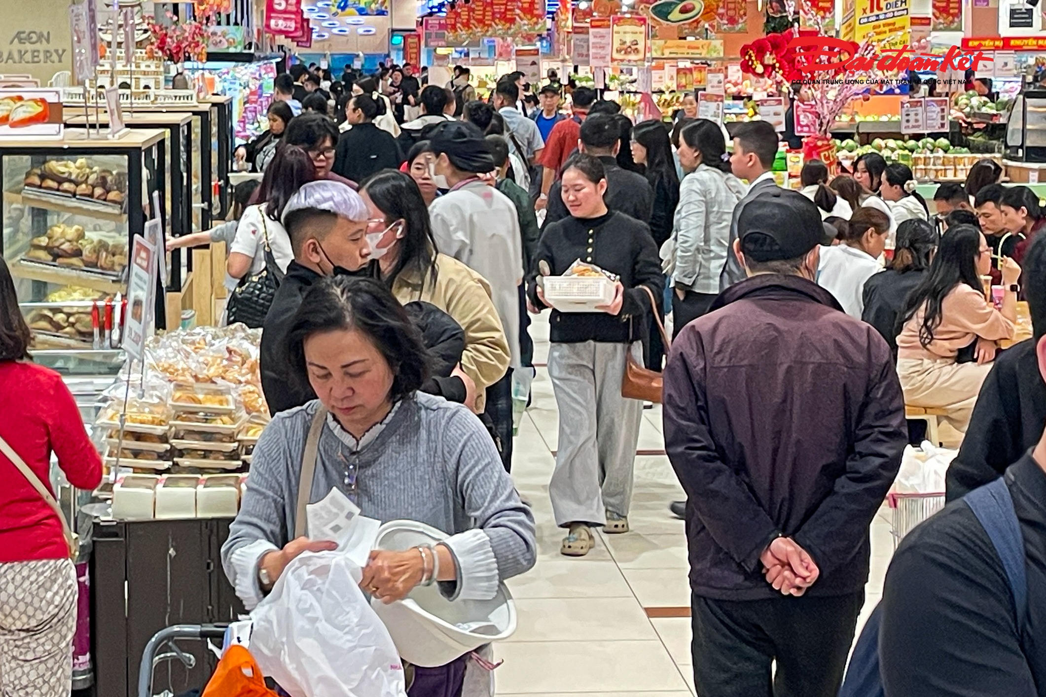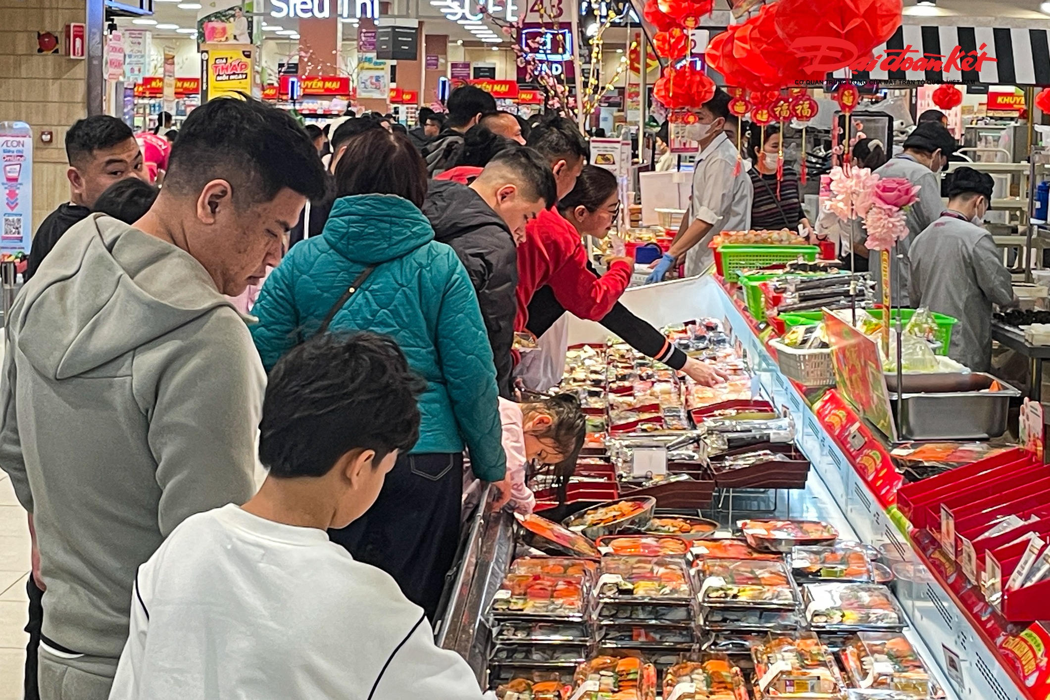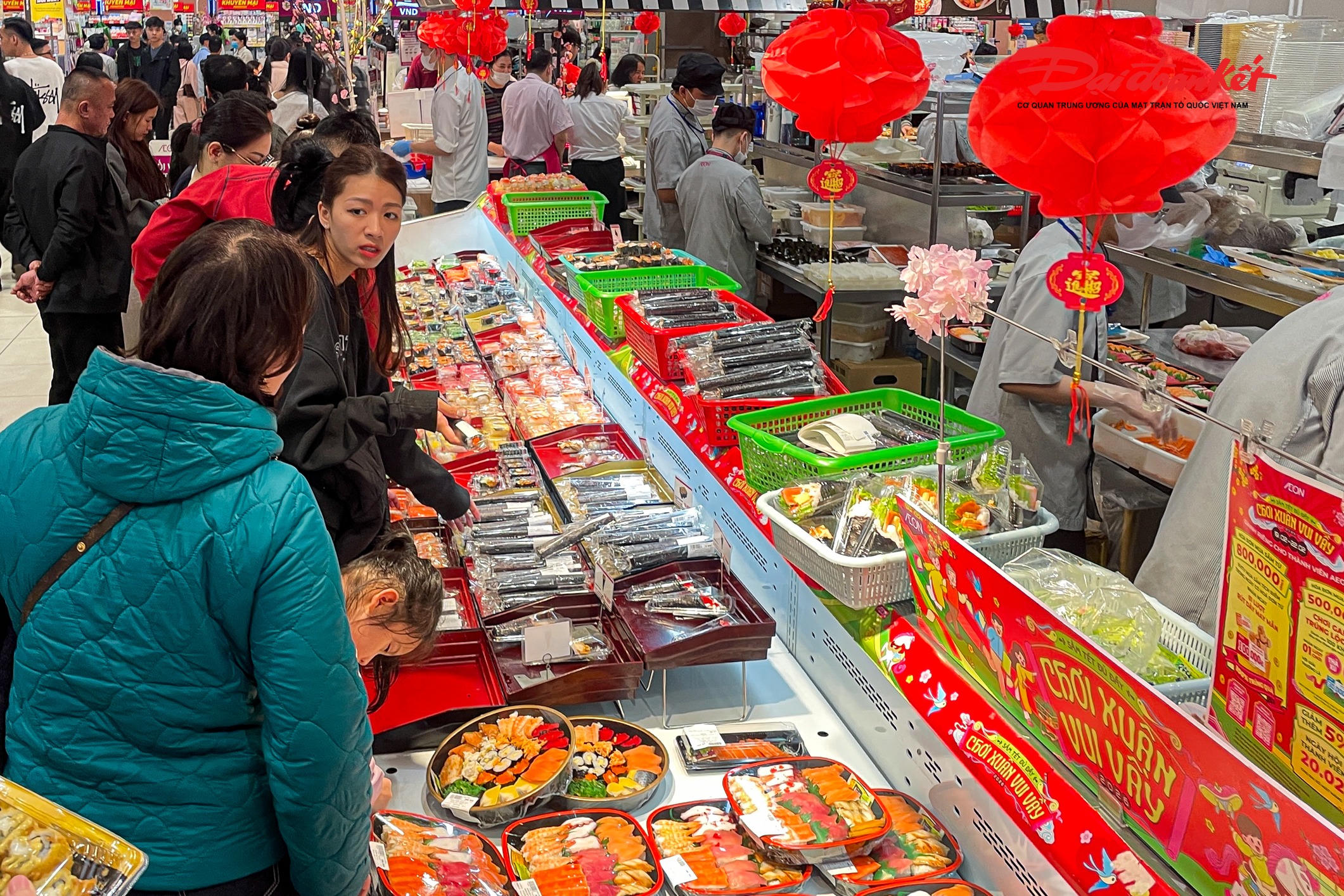 Tại khu bán đồ ăn chế biến sẵn, dòng người ghé mua không ngớt. Các quầy luôn sáng đèn, nhân viên liên tục đóng gói, thanh toán, bổ sung hàng lên kệ để đáp ứng lượng khách đông đúc.