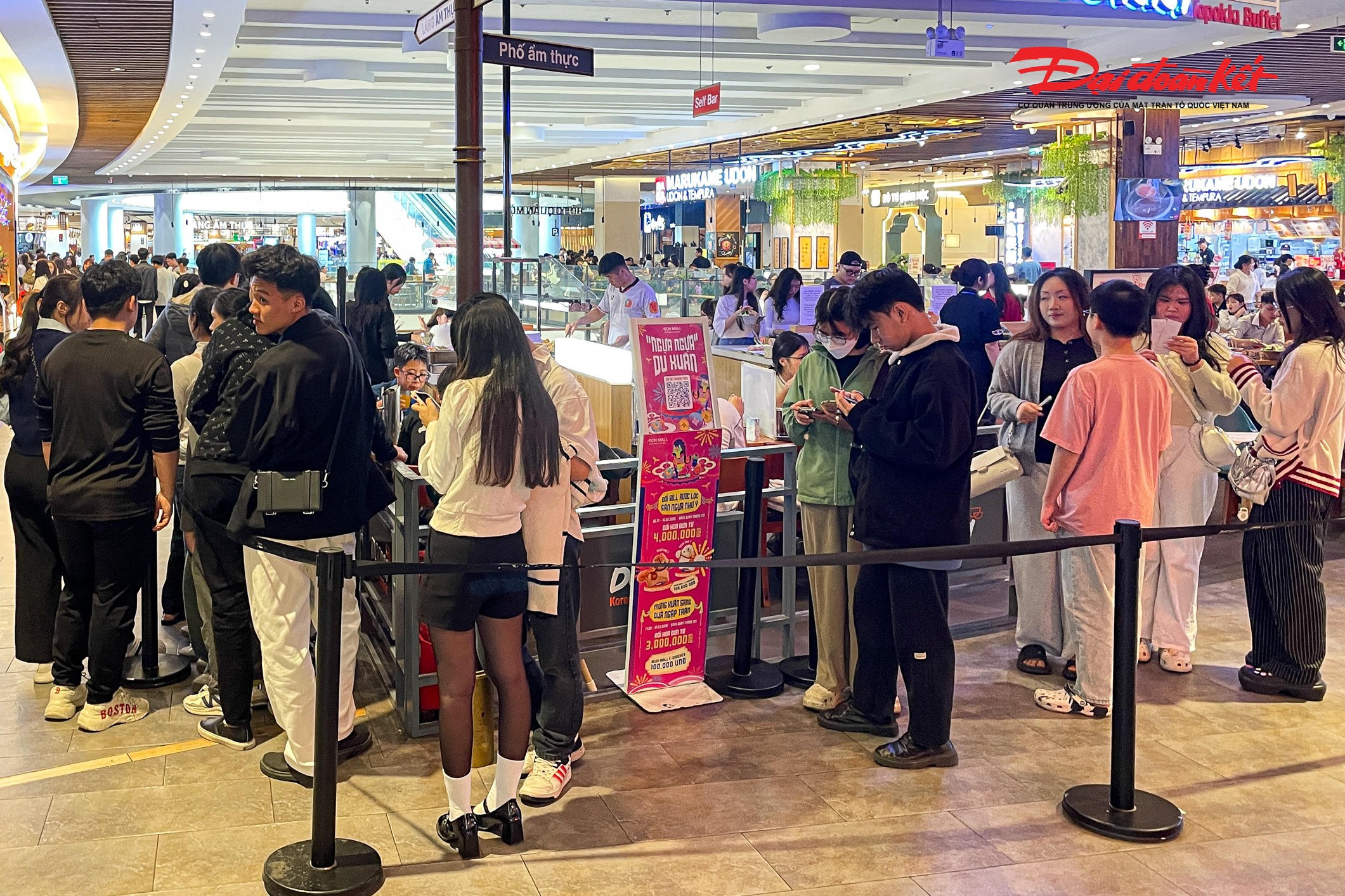Ghi nhận vào khung giờ trưa và đầu giờ chiều, hầu hết các nhà hàng, quán ăn tại một trung tâm thương mại ở Long Biên (Hà Nội) đều kín bàn. Nhiều gia đình phải xếp hàng chờ từ 20–40 phút mới đến lượt. Khu vực lấy số thứ tự luôn đông nghịt người, trong khi nhân viên liên tục tất bật hướng dẫn khách, sắp xếp chỗ ngồi và phục vụ món ăn.