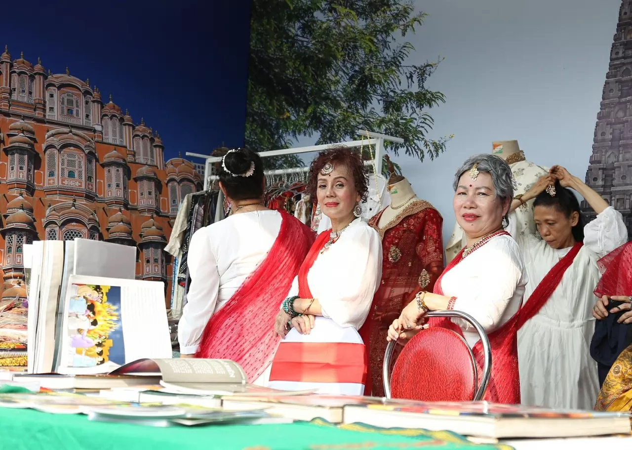 Khách tham quan được thử trang phục truyền thống của Ấn Độ tại gian hàng. (Ảnh: Thành Long)