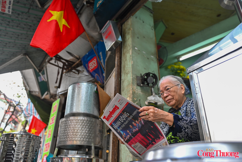 Trên phố Hàng Thiếc, bà Thúy (65 tuổi) cùng con gái đã đọc những thông tin về Đại hội XIV của Đảng từ sớm.