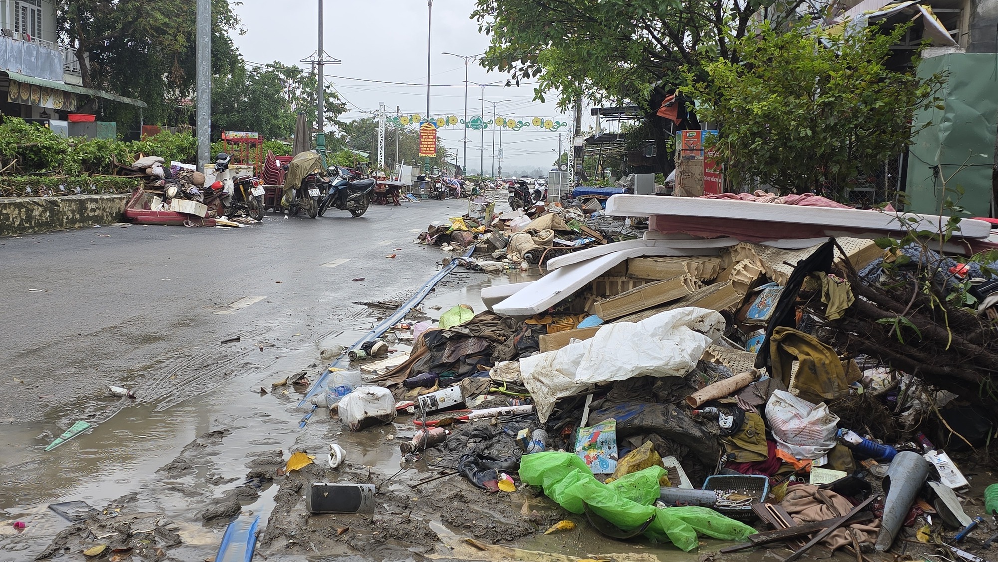 Khắp nơi tại thôn Tây Hòa, rác thải chất thành từng đống lớn bên đường, hầu hết là vật dụng của người dân hư hỏng do ngâm lâu ngày trong nước lũ.