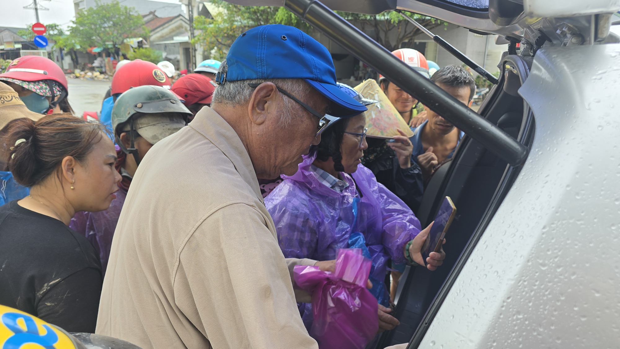 Ở khu vực cao ráo không bị ngập, vợ chồng ông Nguyễn Văn Thân (trú xã Sơn Hòa) sáng nay nấu cơm, mua bánh mì mang đến phát cho người dân thôn Tây Hòa.