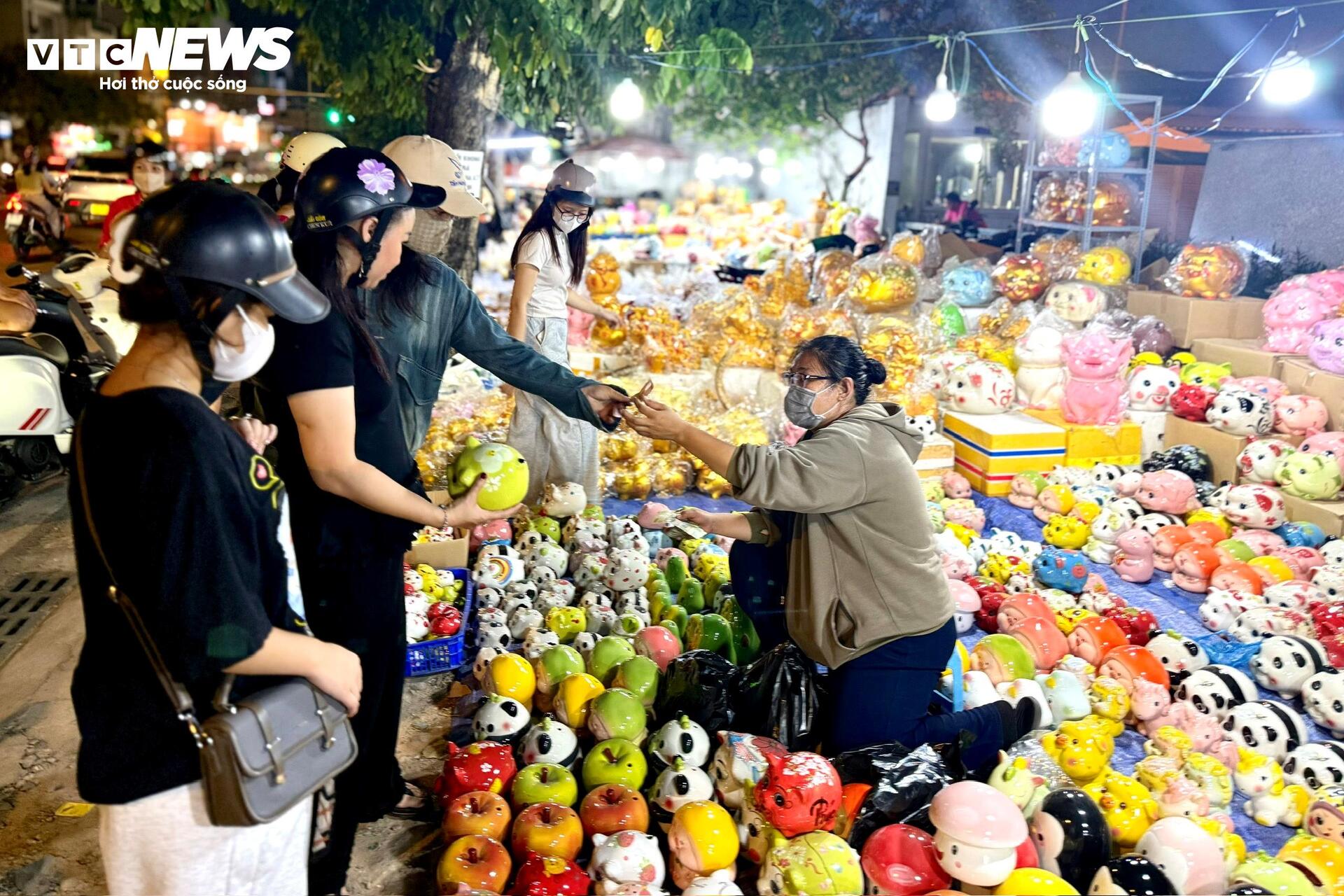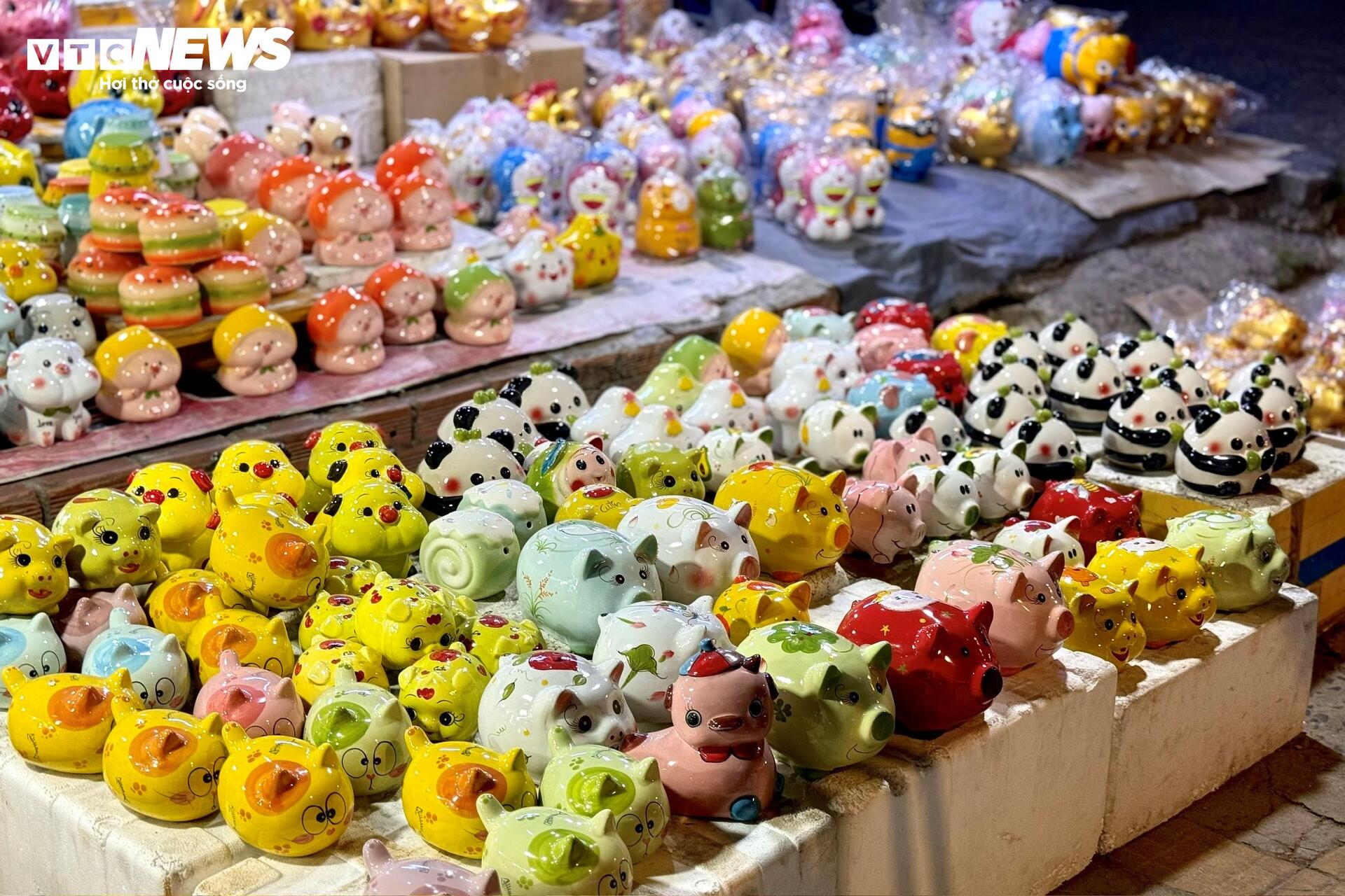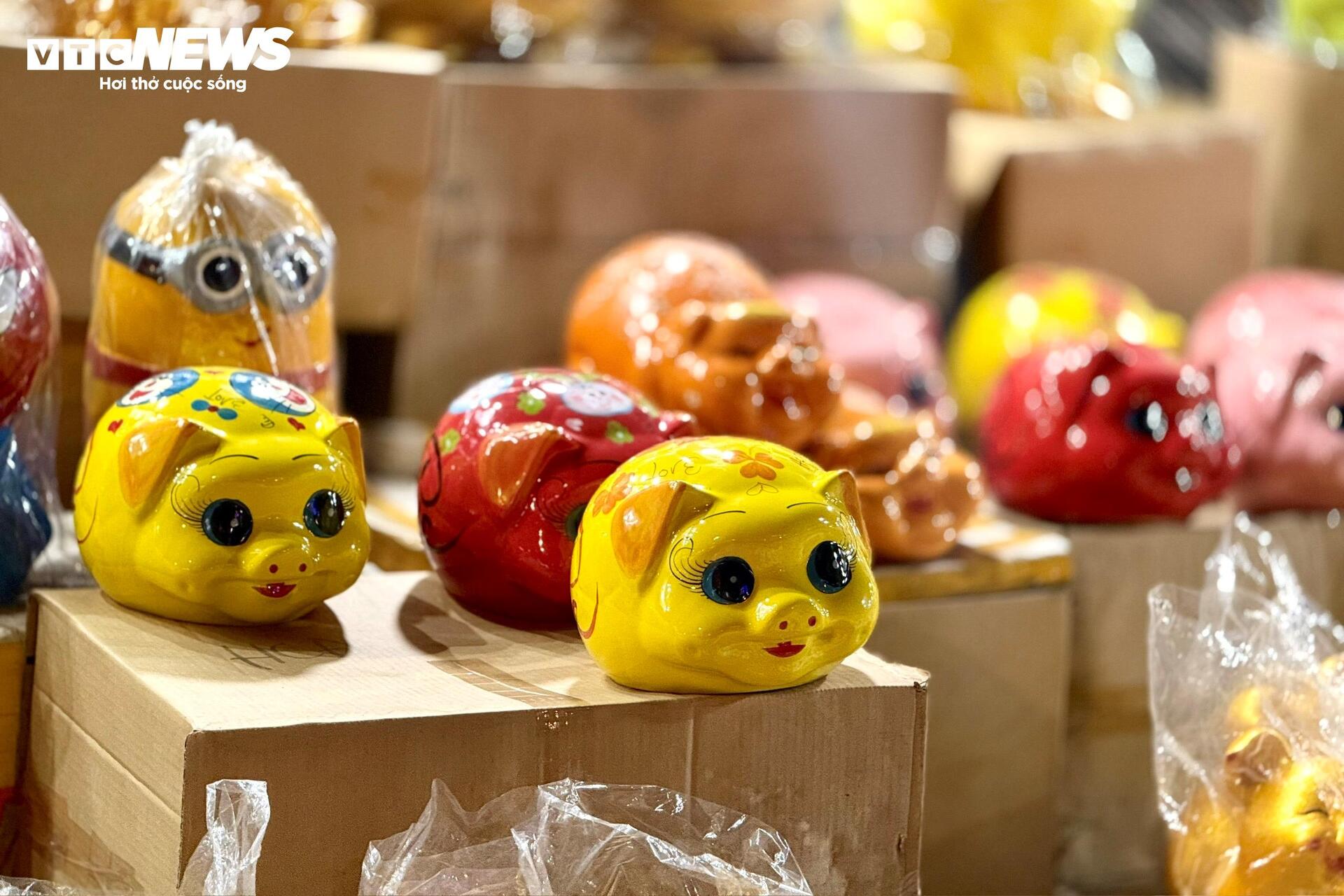 Những chú heo đất đủ kích cỡ được xếp kín vỉa hè. Màu vàng ánh kim chiếm nhiều nhất, xen lẫn màu đỏ, trắng, hồng, trên thân in chữ “Tài”, “Lộc”, “Phát”. Có người đứng im nhiều phút, xoay con heo trên tay, gõ nhẹ, rồi mới quyết định mua.