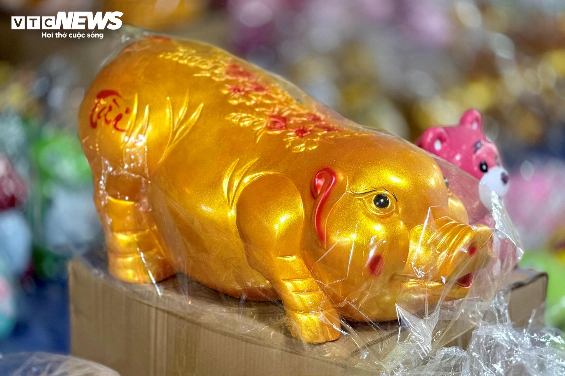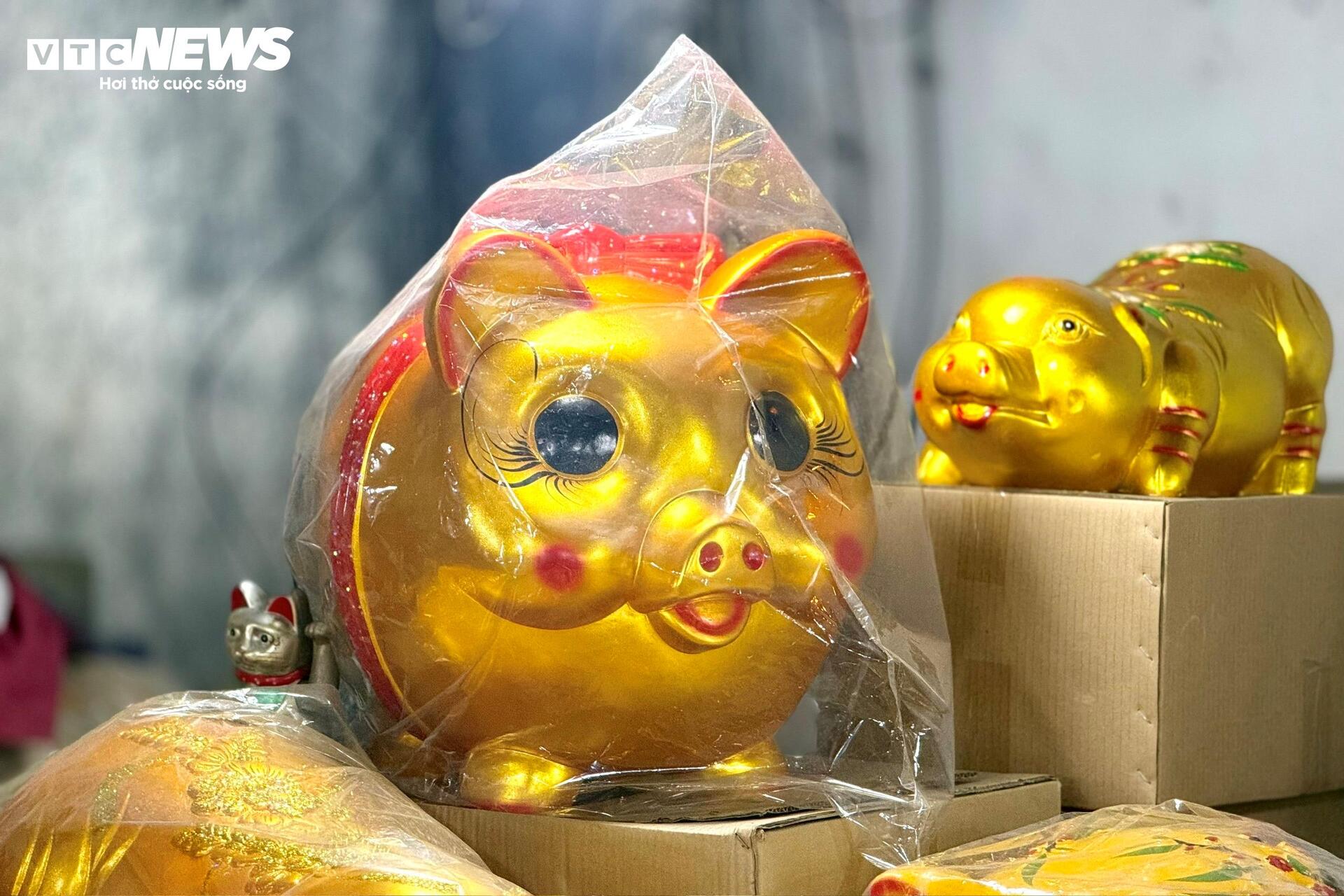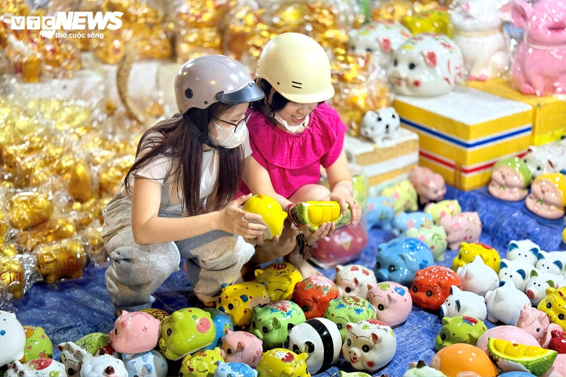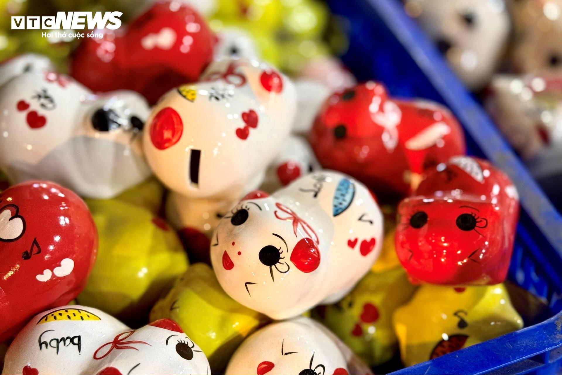 Những chú heo đất đủ kích cỡ được xếp kín vỉa hè. Màu vàng ánh kim chiếm nhiều nhất, xen lẫn màu đỏ, trắng, hồng, trên thân in chữ “Tài”, “Lộc”, “Phát”. Có người đứng im nhiều phút, xoay con heo trên tay, gõ nhẹ, rồi mới quyết định mua.