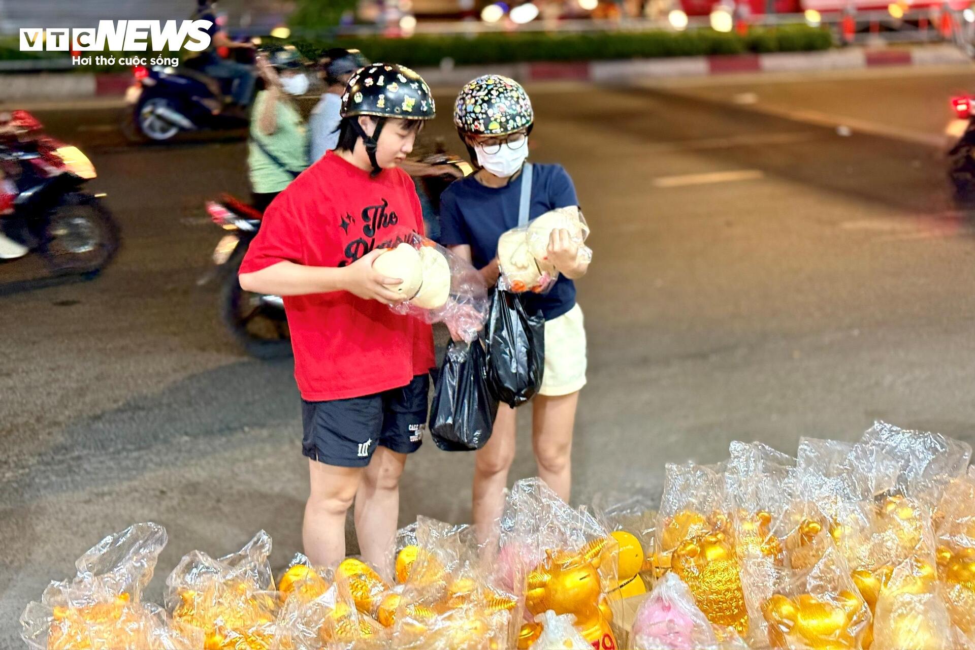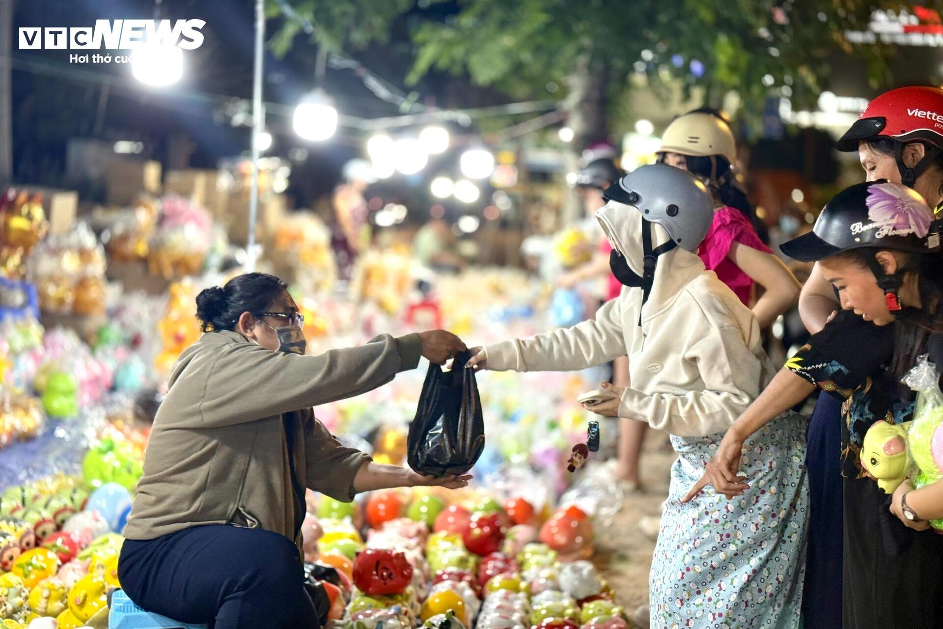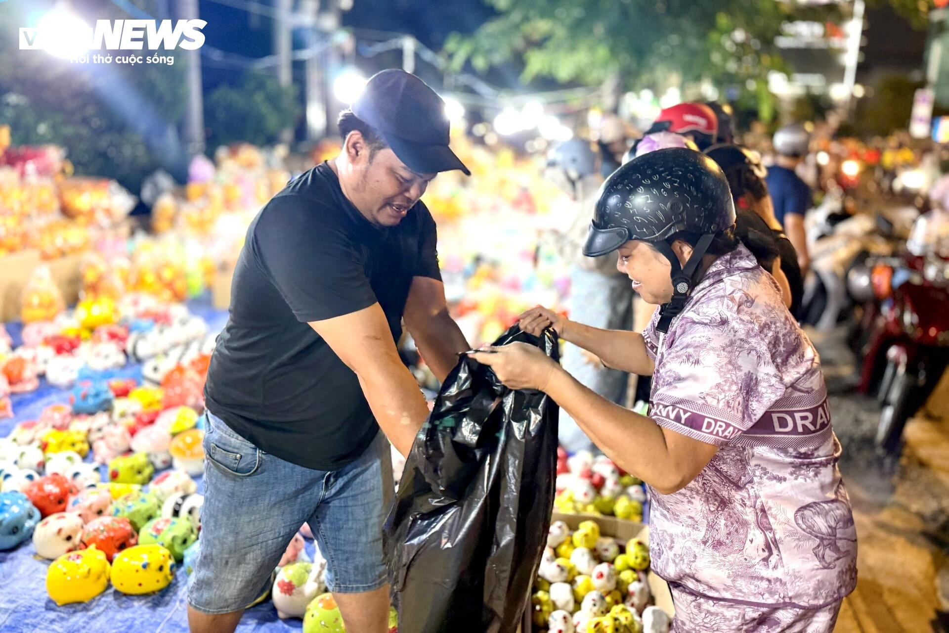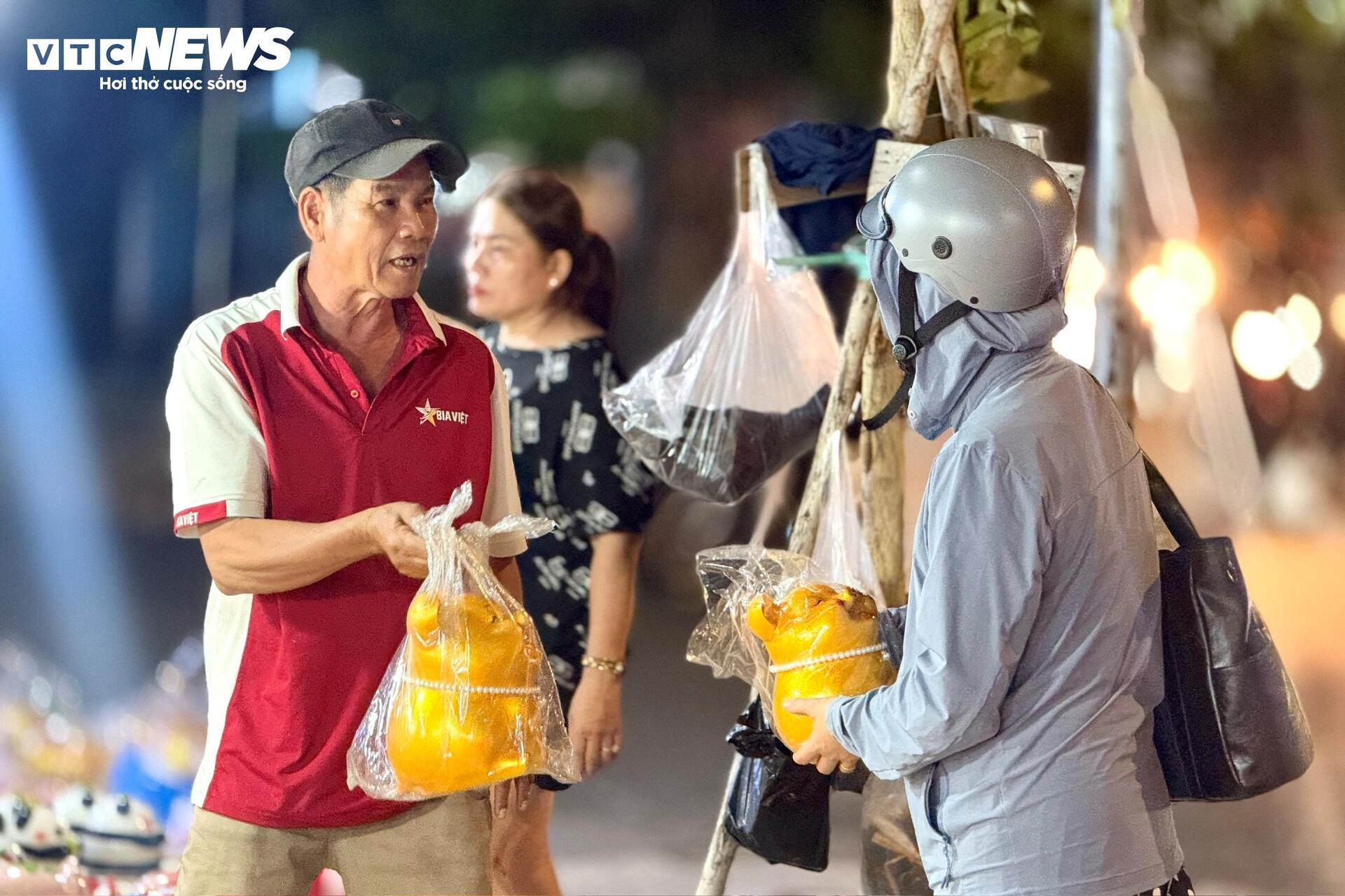"Bán từ chiều tới giờ chưa ngơi tay. Càng về tối càng đông, chắc mọi người tranh thủ mua trước ngày vía Thần Tài. Vài năm nay tôi thấy người mua ngày một đông hơn, đặc biệt là giới trẻ”, một tiểu thương vừa nói vừa nhanh tay heo đất màu vàng vào túi nylon cho khách.