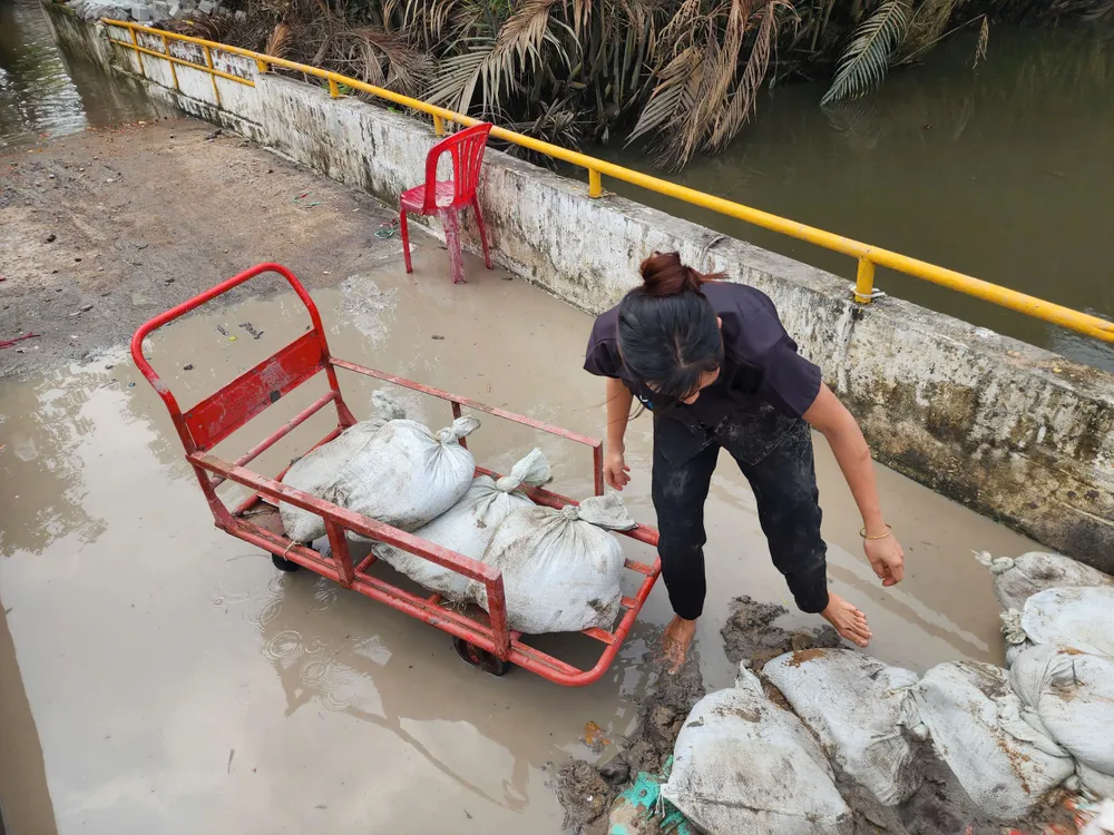 Người dân TP.HCM dùng bao cát để chắn nước. Ảnh: PHẠM HẢI