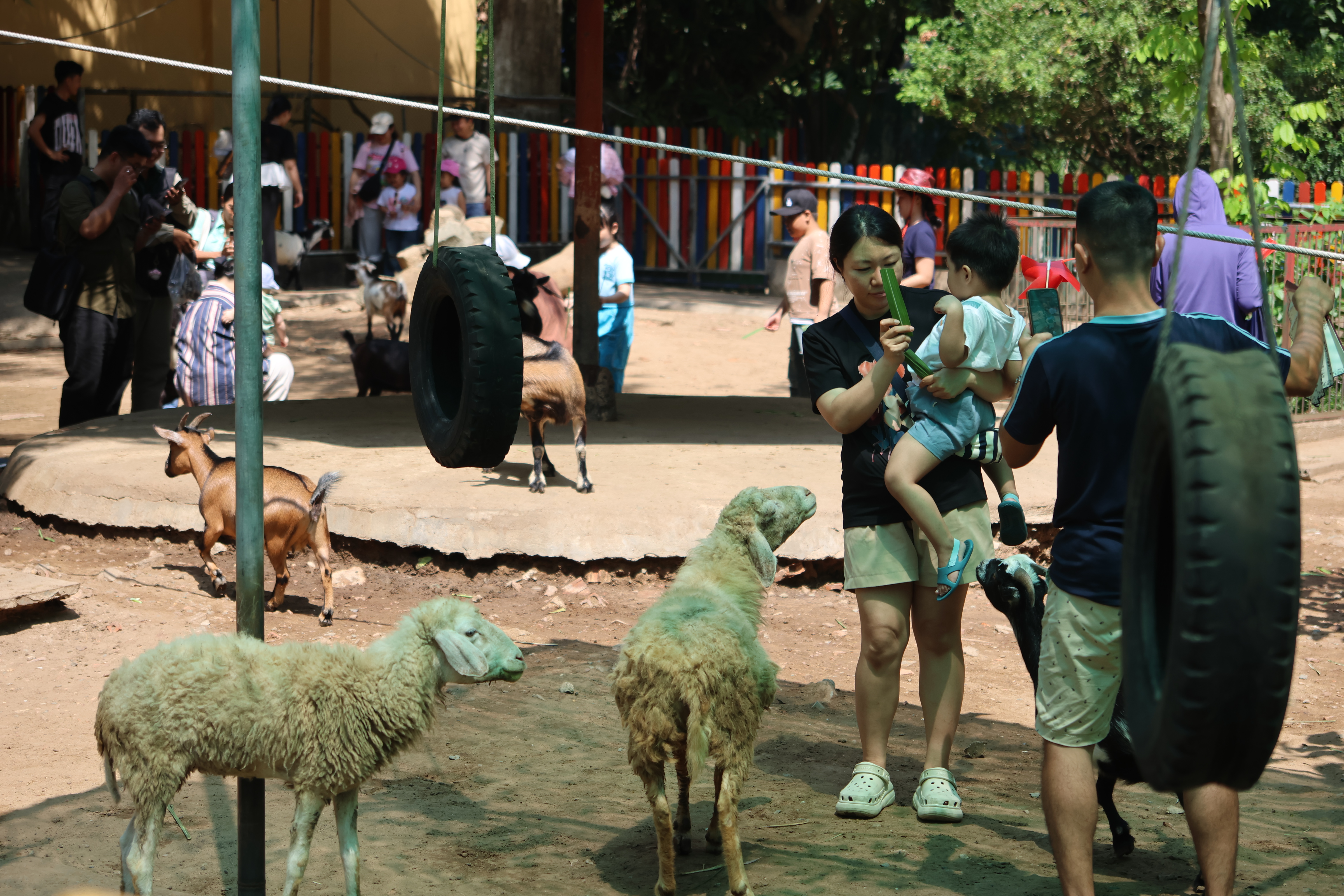 Khu vực chuồng thú và sân chơi nước thu hút rất đông phụ huynh và trẻ em.