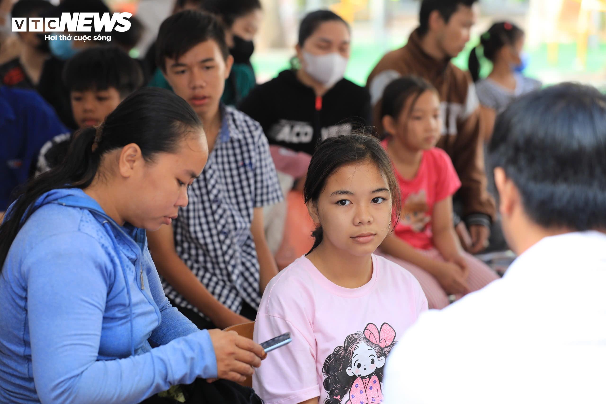 Ngay từ sáng sớm, rất đông bệnh nhi được cha mẹ đưa đến điểm khám bệnh miễn phí tại trường Tiểu học An Bình (xã Phú Giáo).