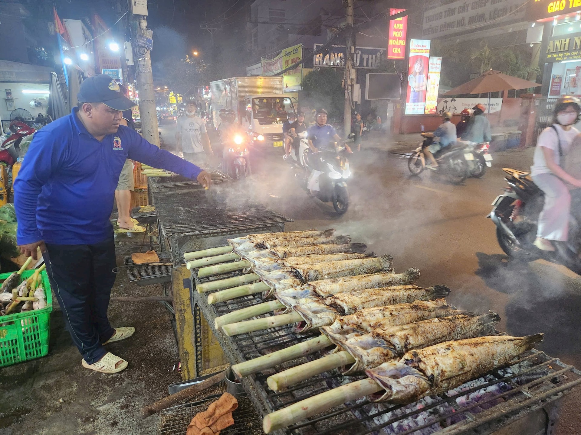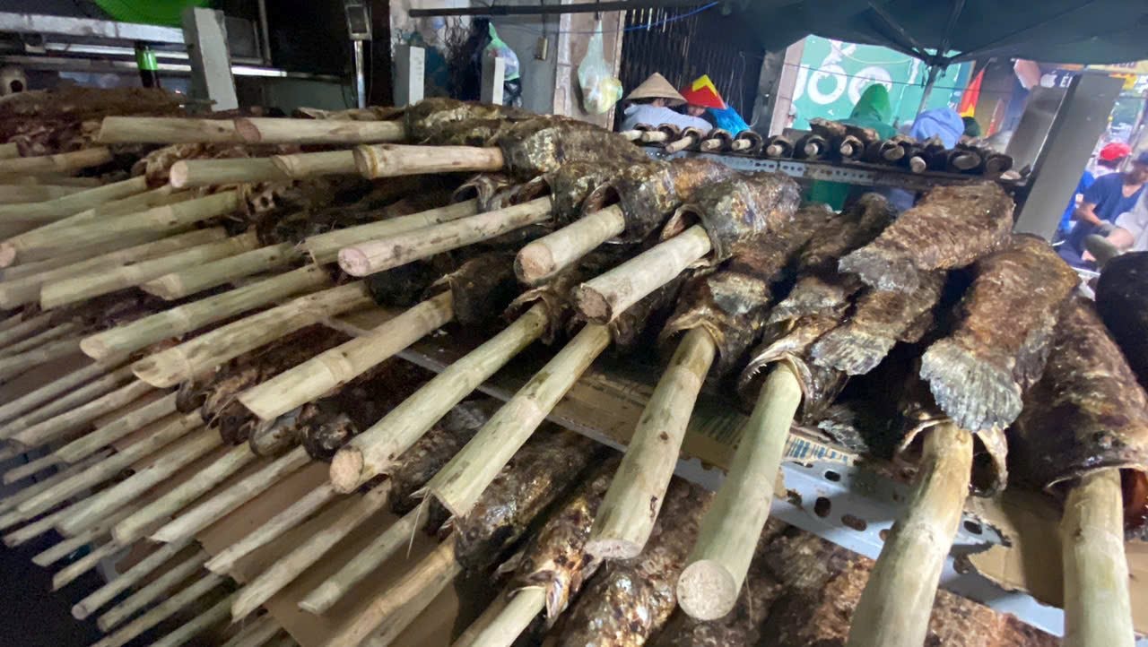 Những chú cá lóc được nướng thơm phức phục vụ người dân.