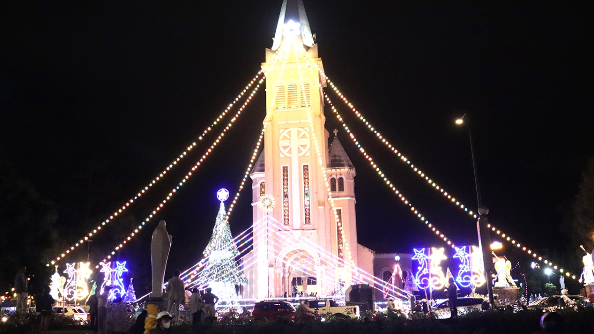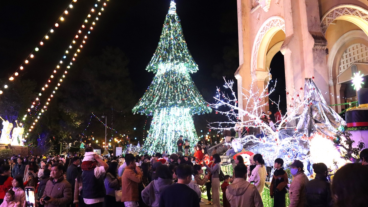Điểm nhấn rực rỡ nhất trong đêm Noel chính là khu vực Nhà thờ Chính tòa Đà Lạt trên đường Trần Phú. Giữa không gian cổ kính, cây thông Noel khổng lồ cùng hàng vạn ánh đèn led tỏa sáng, thu hút hàng ngàn lượt người dân và du khách đổ về.