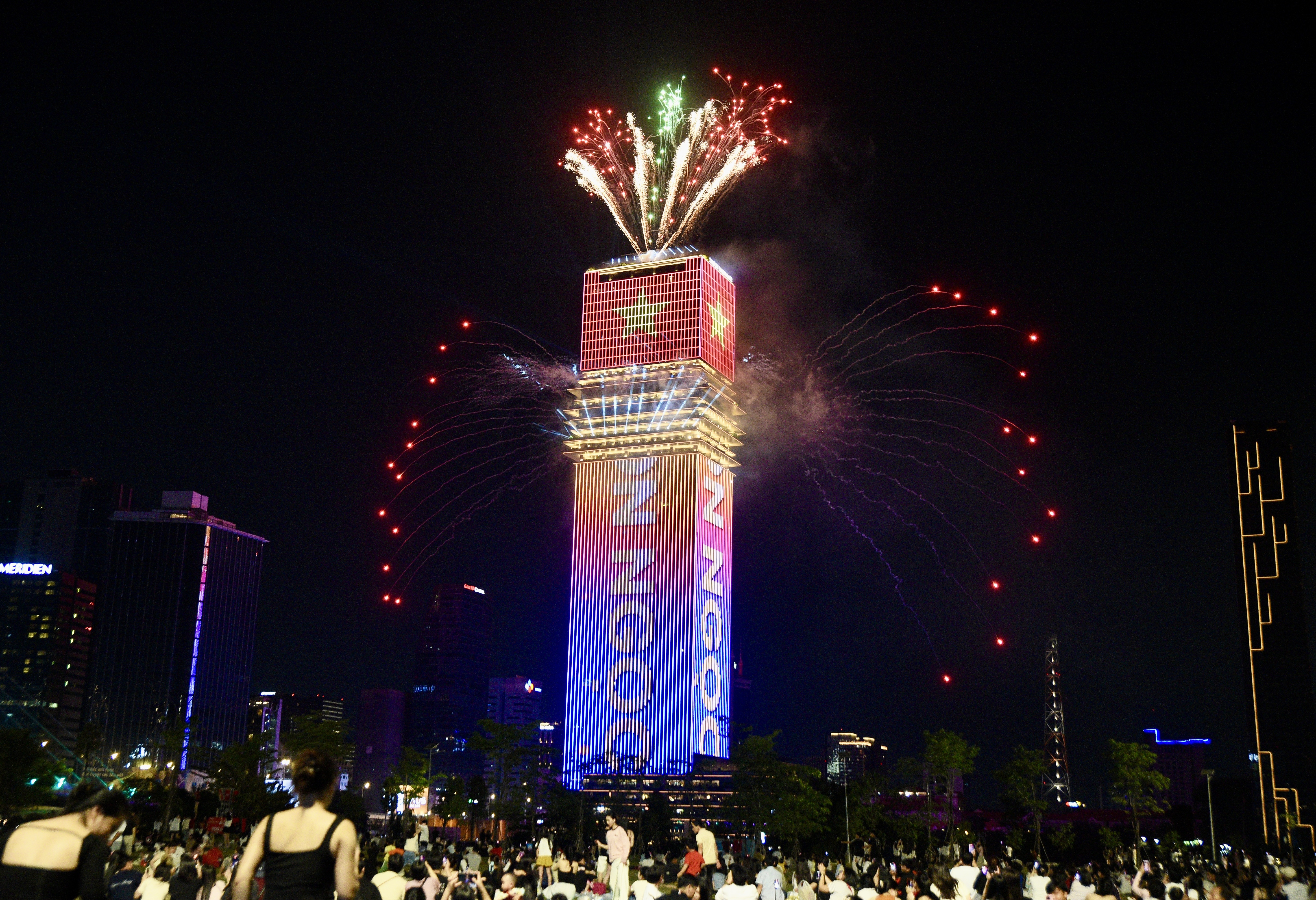 Đúng 21 giờ, bầu trời trung tâm TP.HCM bừng sáng bởi những màn pháo hoa rực rỡ từ điểm bắn pháo hoa tầm cao khu vực đường hầm sông Sài Gòn (phường An Khánh) và tòa nhà tài chính Saigon Marina IFC (phường Sài Gòn) chính thức khai hỏa.