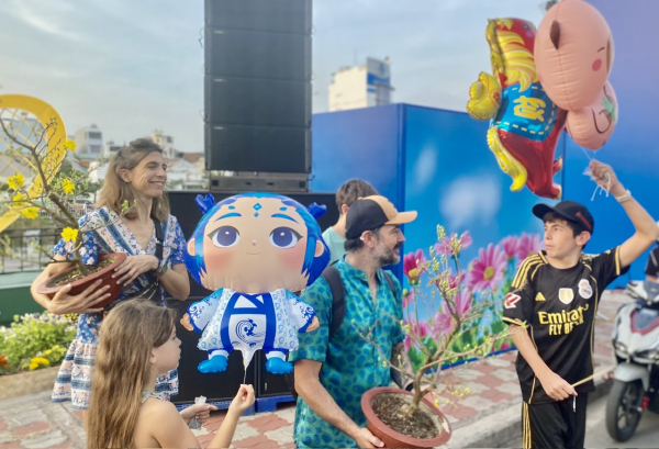 Một gia đình người nước ngoài sống tại TP Hồ Chí Minh tậu 2 chậu mai về chưng Tết.