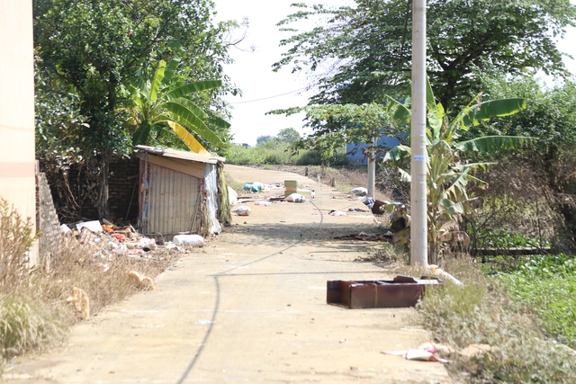 Đường vào làng đã khô nhưng còn ngổn ngang rác từ trận lụt. Ảnh: T.Sơn.