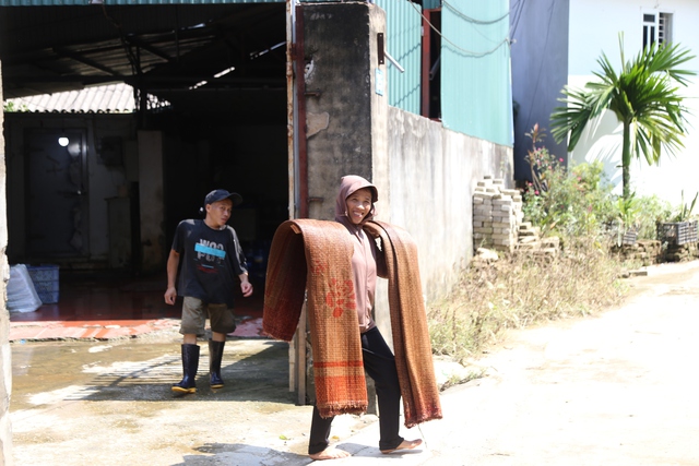 Đến nhà anh Kiên, người chuyên làm giò chả tại làng. Trận lũ vừa qua, 4 tủ thịt đông, ước tích cả trăm triệu chìm theo dòng nước lũ. Những ngày này, cả gia đình chia nhau từng việc người xúc bùn, người phơi quần áo, thế nhưng đến nay vẫn còn ngổn ngang. Anh Kiên thở dài "chưa biết đến bao giờ mới khắc phục xong".