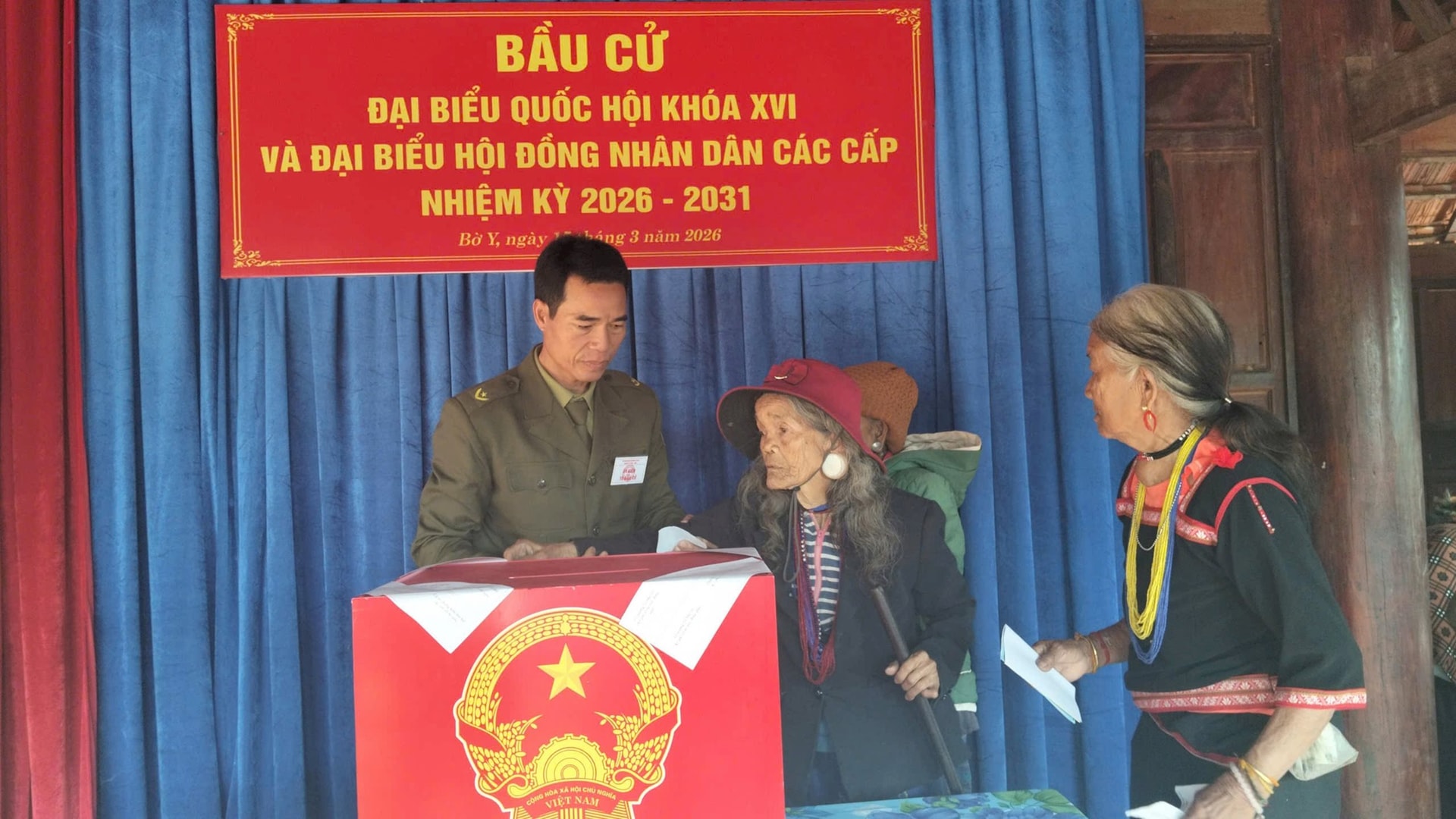 Ngay từ sáng sớm, đông đảo cử tri đã tập trung tại các điểm bầu cử. Tại khu vực bỏ phiếu số 25, thôn Đăk Mế, xã biên giới Bờ Y, không khí ngày hội diễn ra trang trọng, phấn khởi. Cờ hoa rực rỡ, các khâu tổ chức được chuẩn bị chu đáo, tạo điều kiện thuận lợi để người dân tham gia bỏ phiếu.