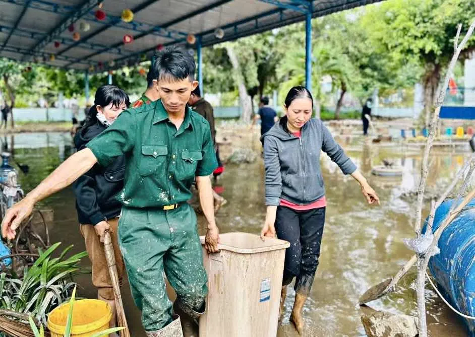 Lực lượng dân quân xã Tuy Phong cùng các đơn vị liên quan hỗ trợ dọn dẹp nhà cửa từng hộ dân bị ảnh hưởng sau sự cố. Nhiều người dân cho biết, khi nước rút từ tối 1-11 tới nay, không chỉ có bùn đất, rác thải mà còn cả xác động vật cần được xử lý khẩn trương tránh nguy cơ dịch bệnh.