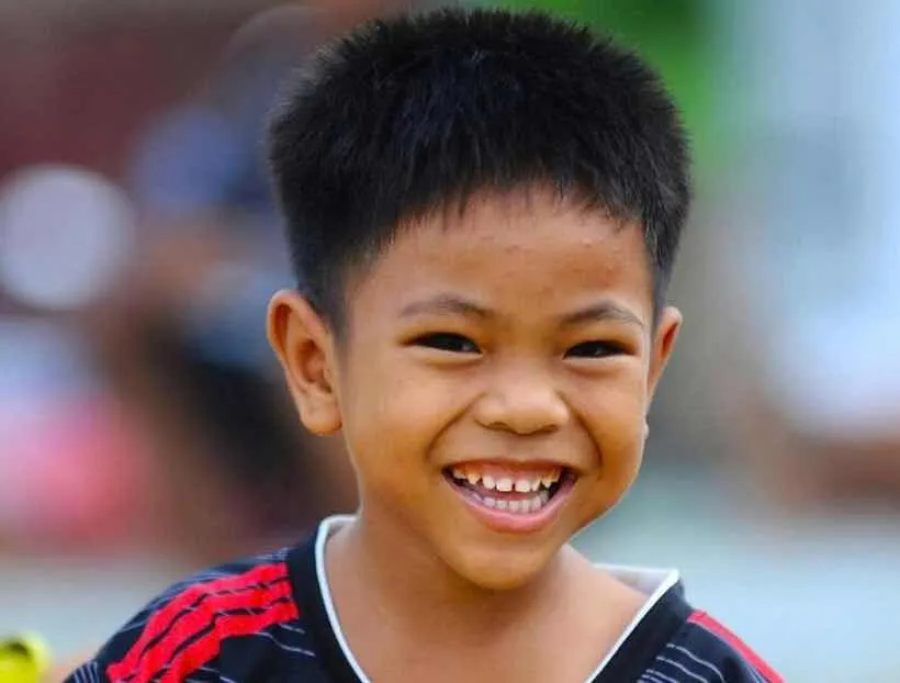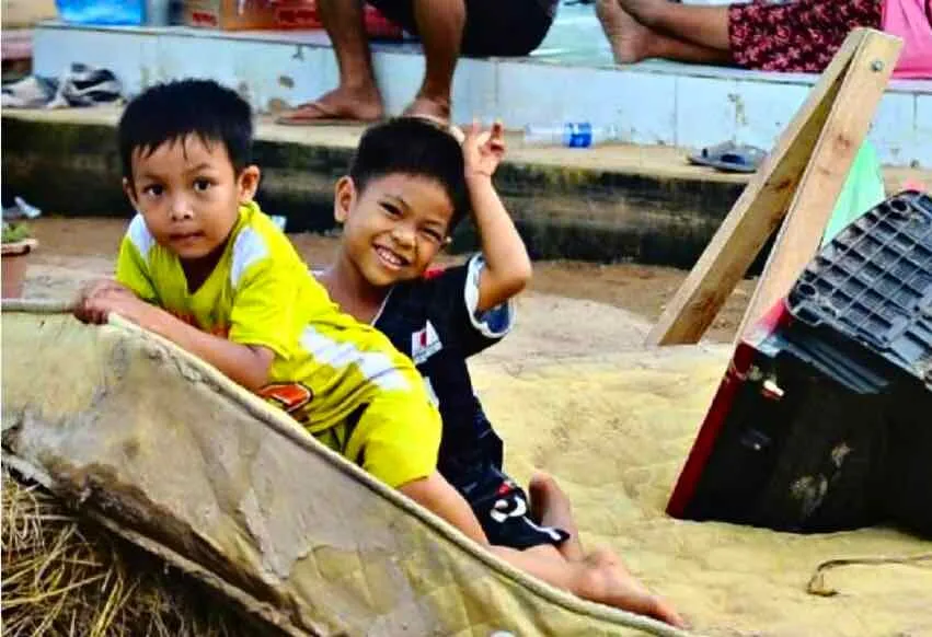 Nụ cười trẻ nhỏ hồn nhiên tại chân núi Tân Lai khi cùng bố mẹ khắc phục hậu quả của vụ vỡ hồ nước.