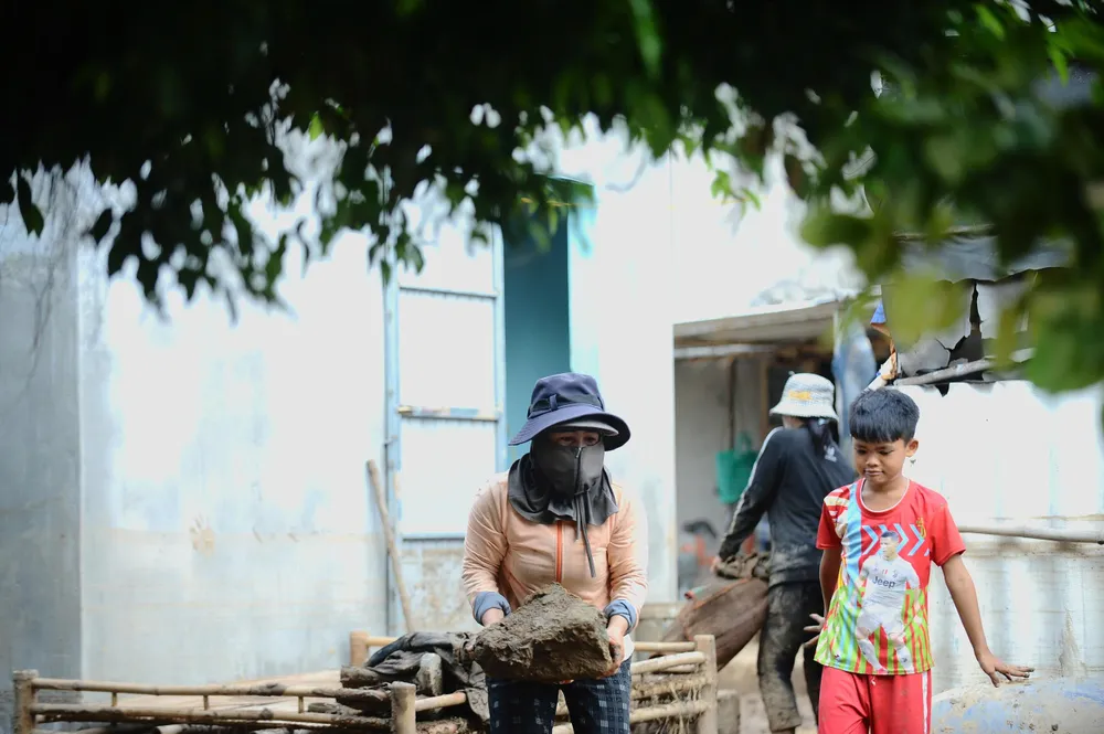 Thanh niên, phụ nữ trong thôn đều xắn tay dọn dẹp căn nhà để sớm trở lại cuộc sống thường nhật.