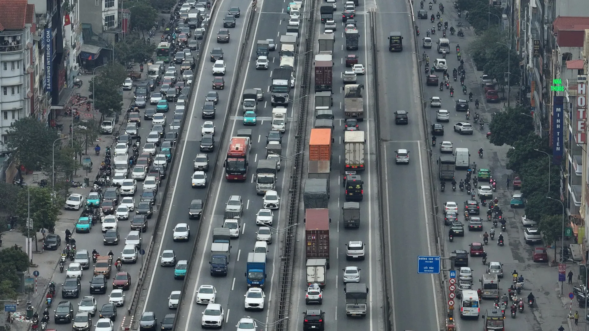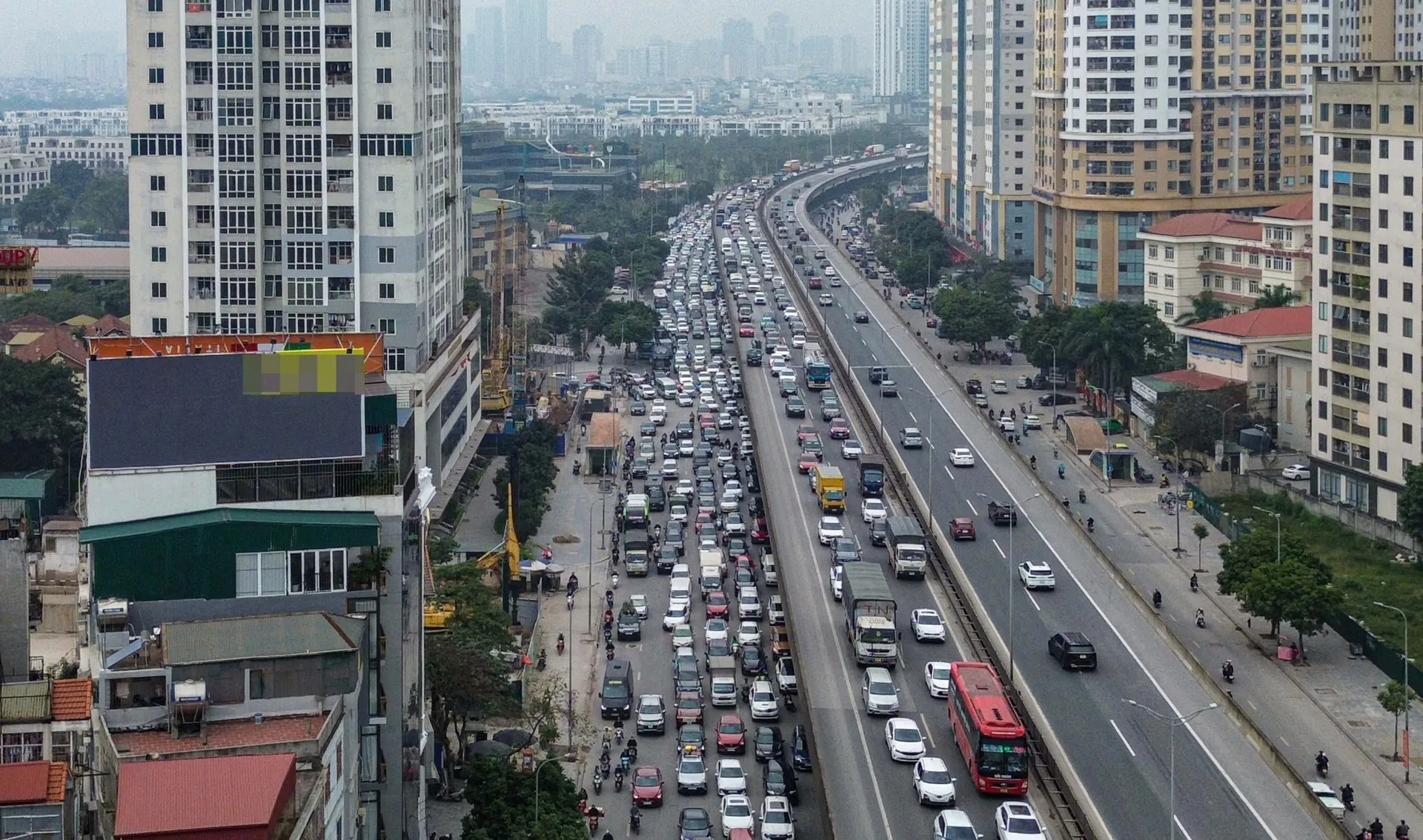 Từ sáng, tuyến Vành đai 3 trên cao xuất hiện tình trạng ùn ứ theo hướng ra khỏi trung tâm thành phố. Có thời điểm, dòng phương tiện nối dài khoảng 5km trên đường Vành đai 3 trên cao, hướng từ Mai Dịch ra cửa ngõ phía Nam thành phố.