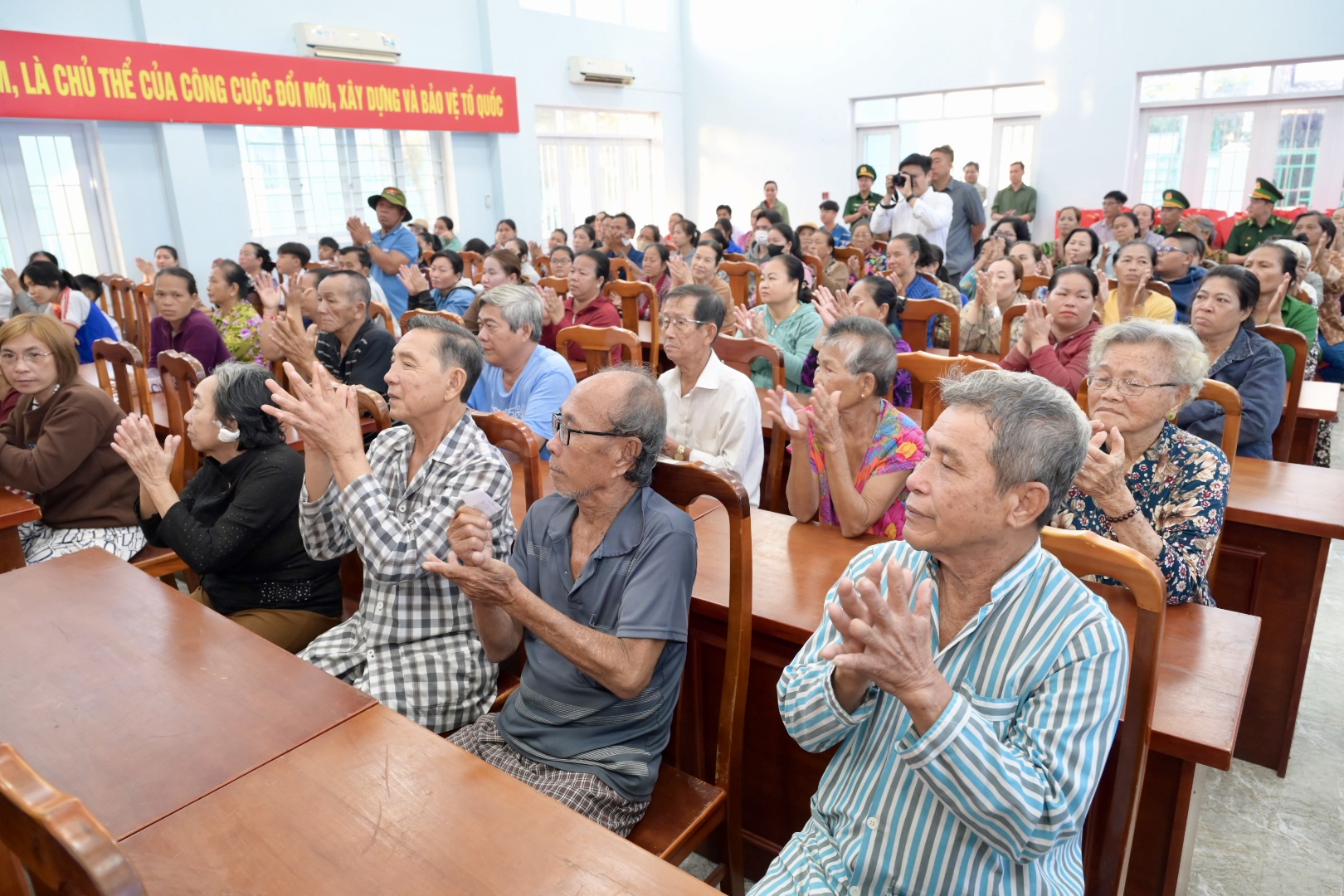 Người dân xã Thạnh An vui mừng nhận được quà tết. Ảnh: VĂN MINH