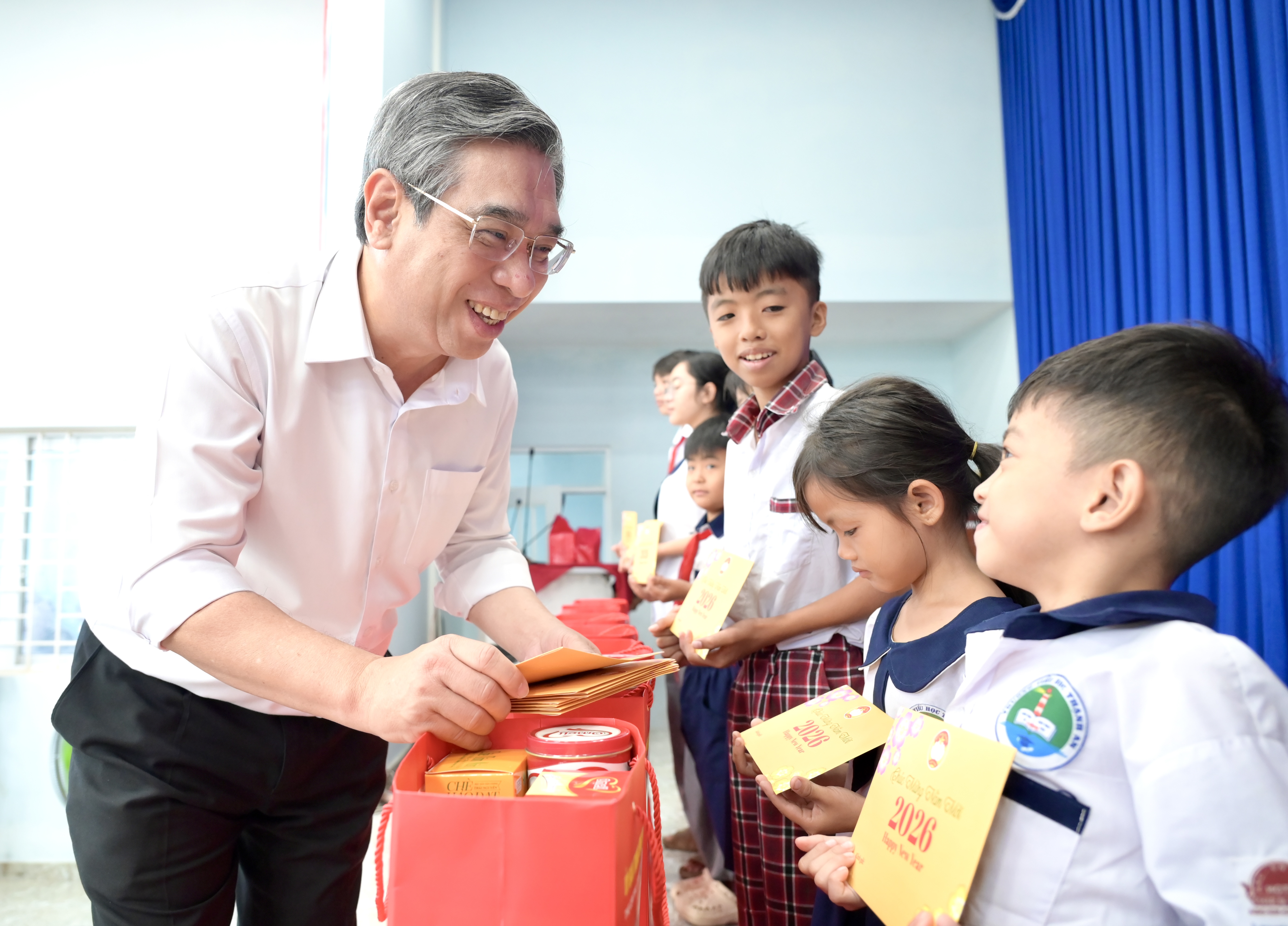 Đồng chí Nguyễn Phước Lộc trao quà tết đến các cháu học sinh ở xã Thạnh An. Ảnh: VĂN MINH