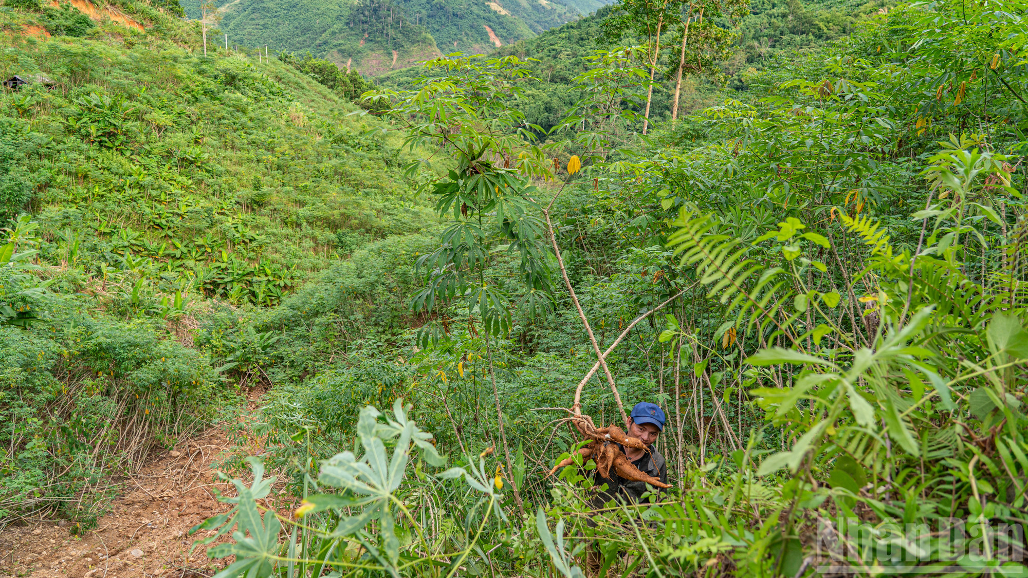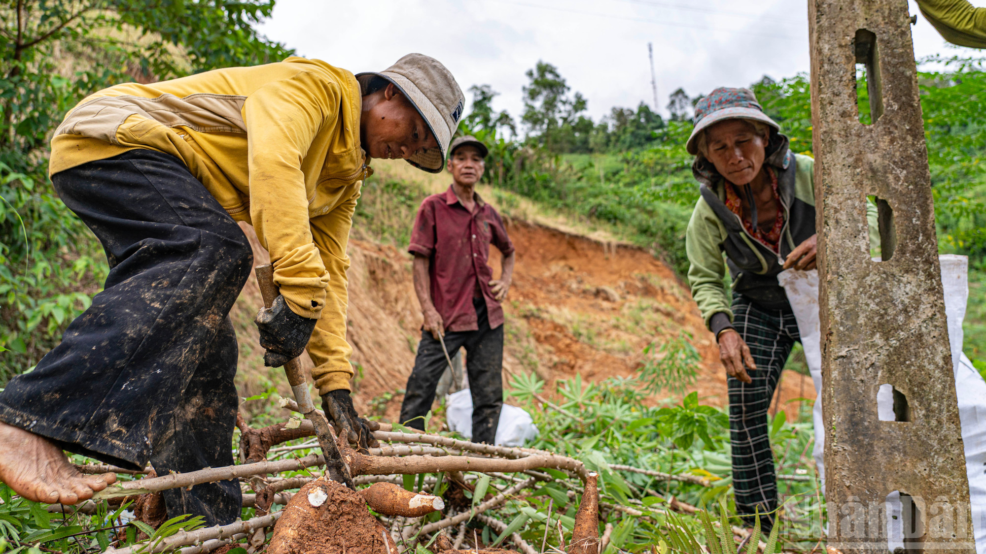 Những người đàn ông đảm nhận phần việc nặng nhọc, đào bới khoai mì dưới lớp đất dày ở mép vực.