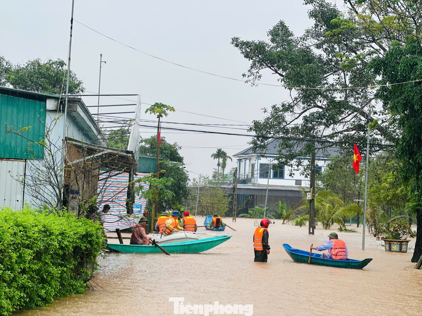 Nhiều đoạn đường trục chính bị chia cắt, phương tiện giao thông không thể di chuyển, người dân phải dùng thuyền để đi lại. Một số người dùng thuyền để chở đồ đạc, người già đến vị trí cao hơn để tránh lũ.