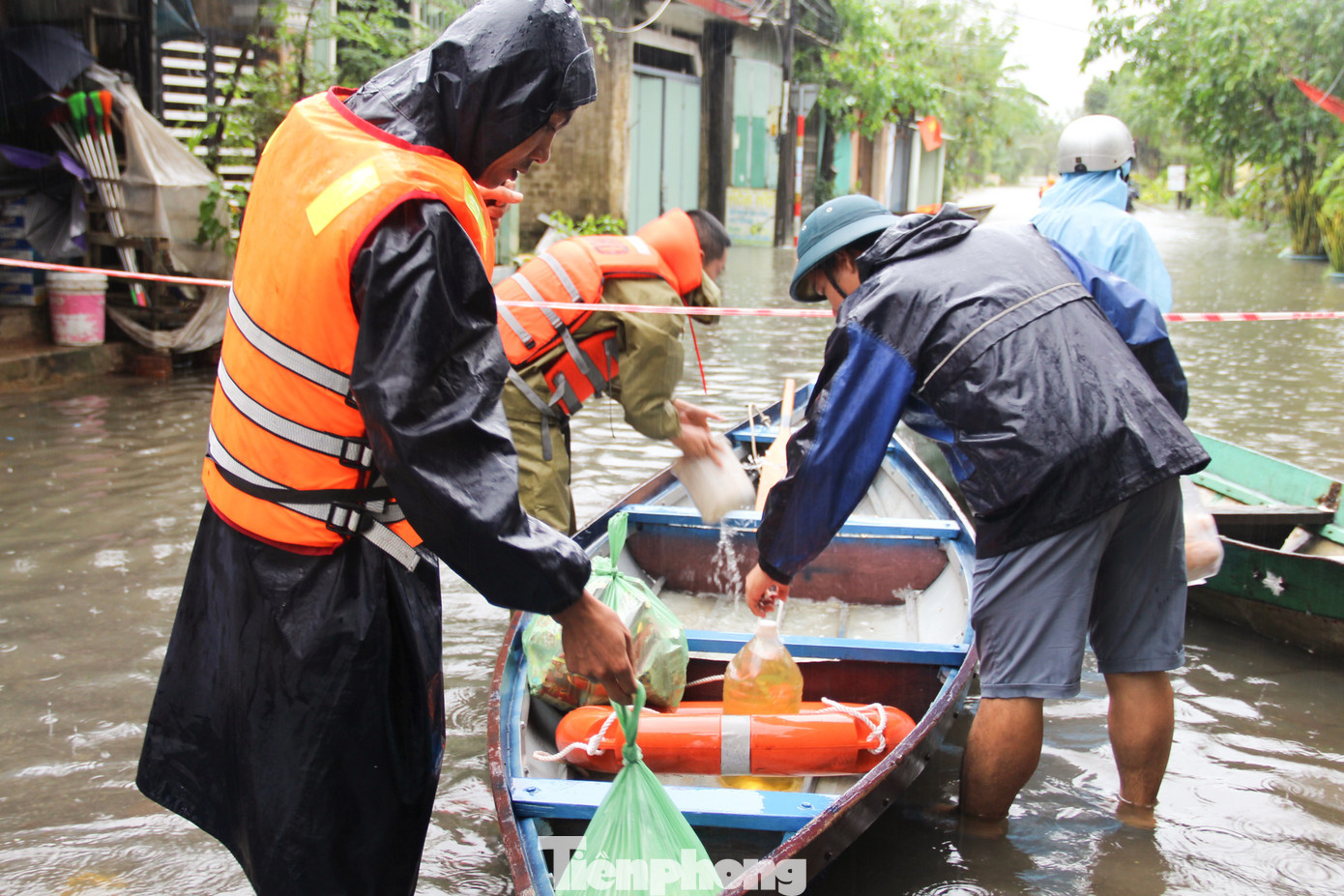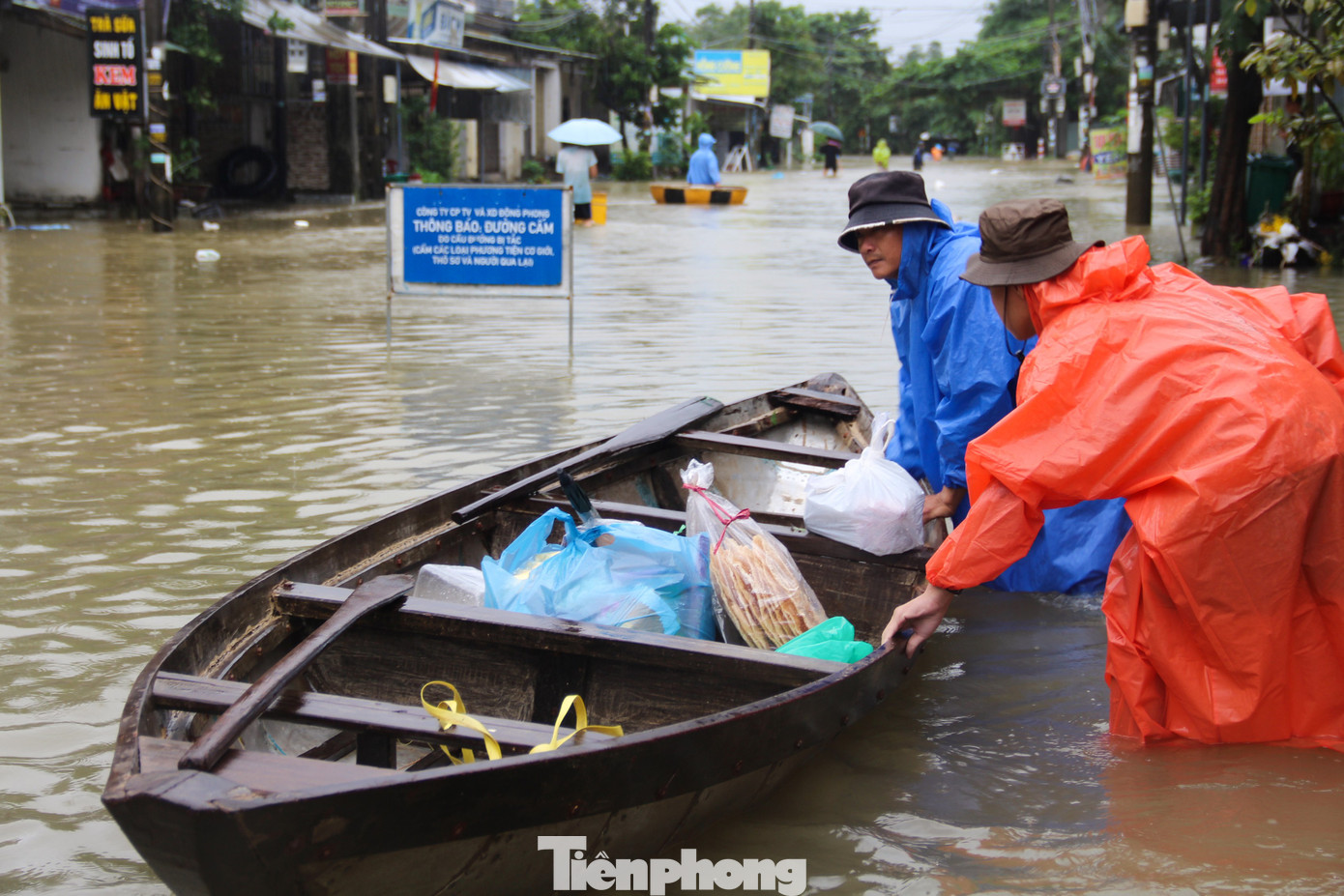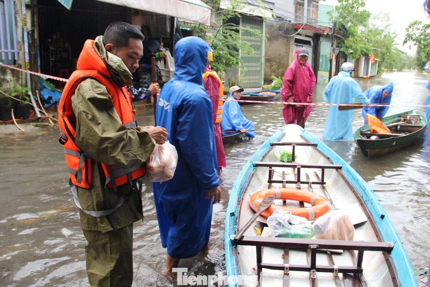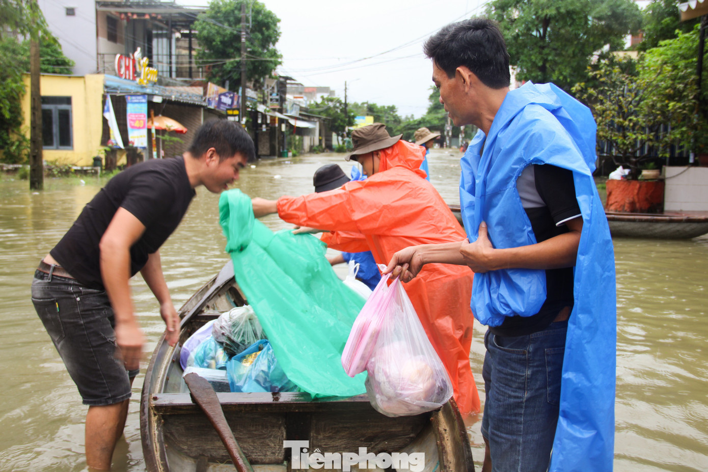 Hàng chục lượt thuyền nhôm liên tục chèo ra, vào các khu vực ngập sâu, trên thuyền đầy ắp thực phẩm, nhu yếu phẩm.