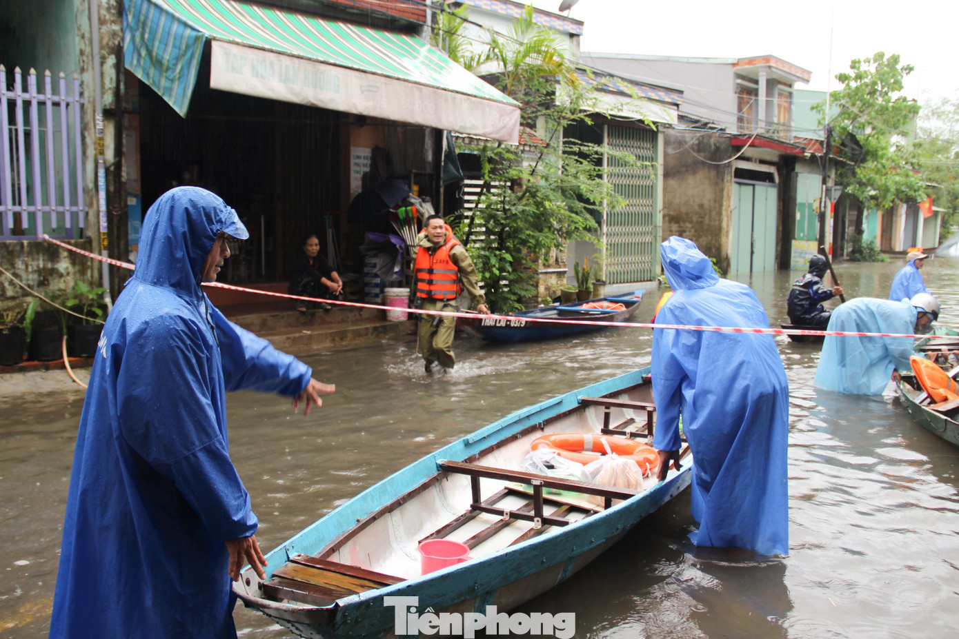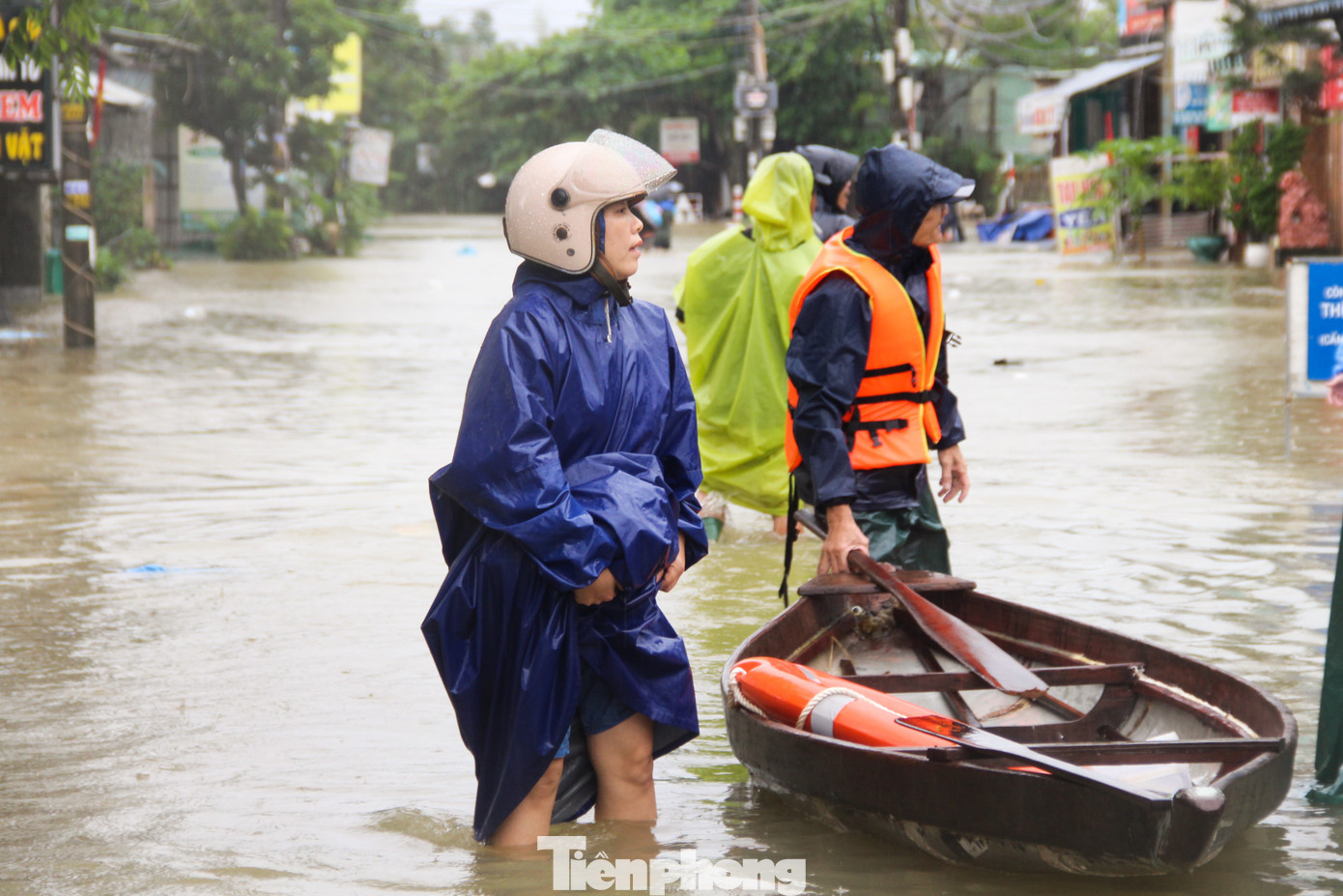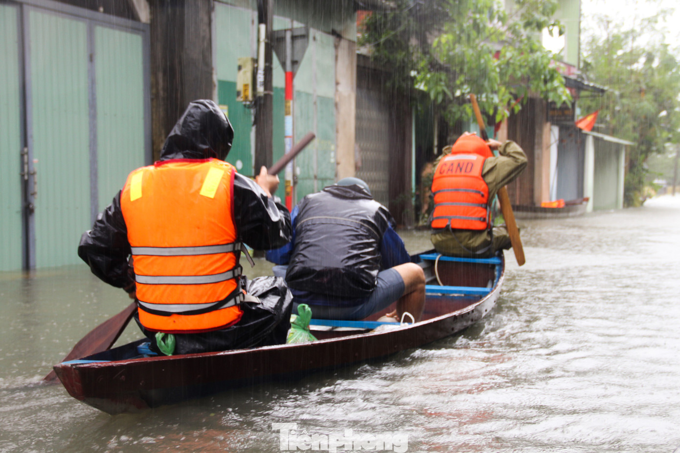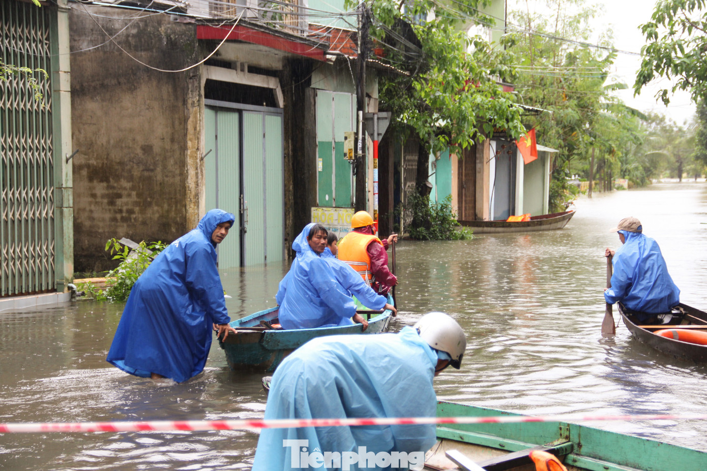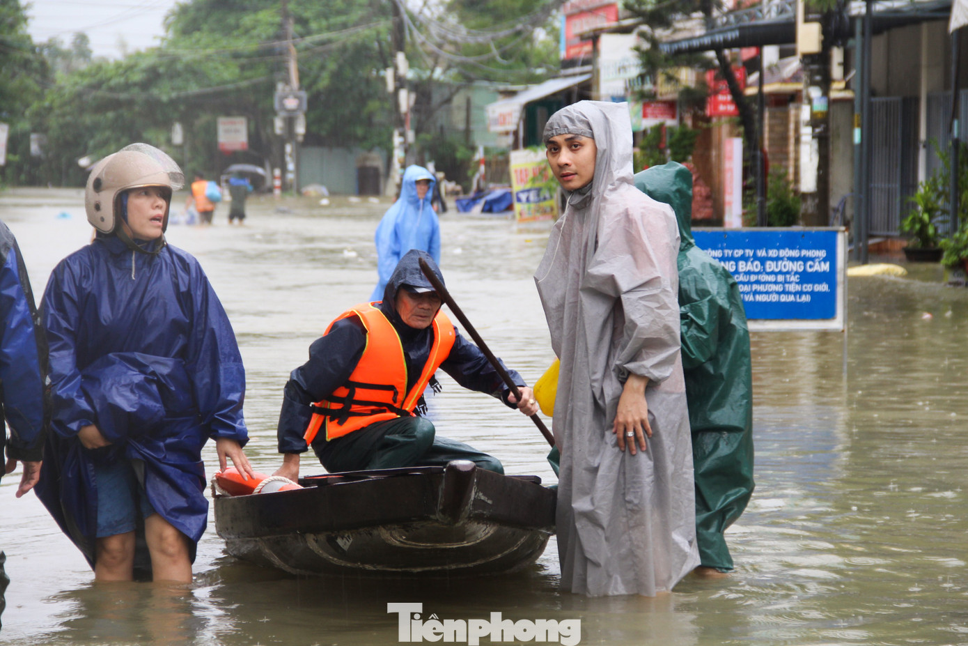 Tuyến đường chính của thôn ngập sâu khoảng 2-3m, dòng nước chảy xiết khiến việc chèo thuyền cũng gặp nhiều nguy cơ. Bởi vậy, mỗi chiếc thuyền chỉ chở khoảng 2-3 người, chủ yếu là thanh niên, trai tráng, biết bơi.