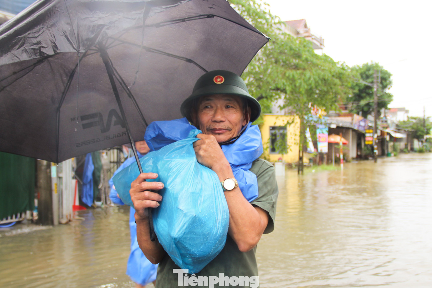 Nhà ở thôn Túy Loan, ông Võ Văn Chiến cũng xắn quần, đội mưa lội nước khoảng 4km để đi chợ. Nhà ông đã ngập sâu trong nước, hai vợ chồng ông phải sơ tán sang nhà con trai để tránh lụt. Sáng nay, ông cùng con đi chợ để mua thêm thực phẩm.