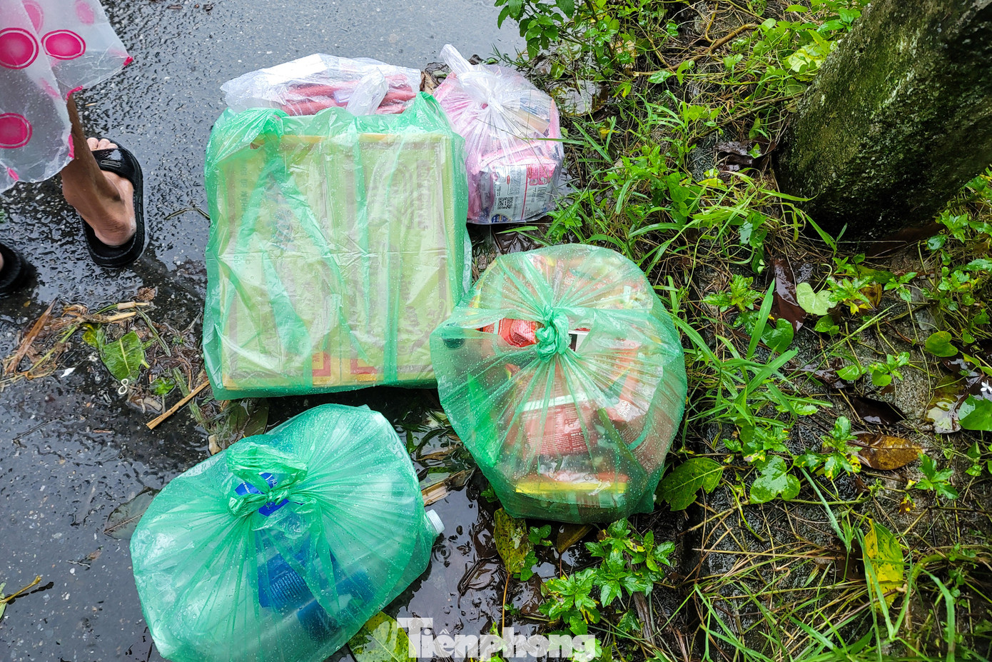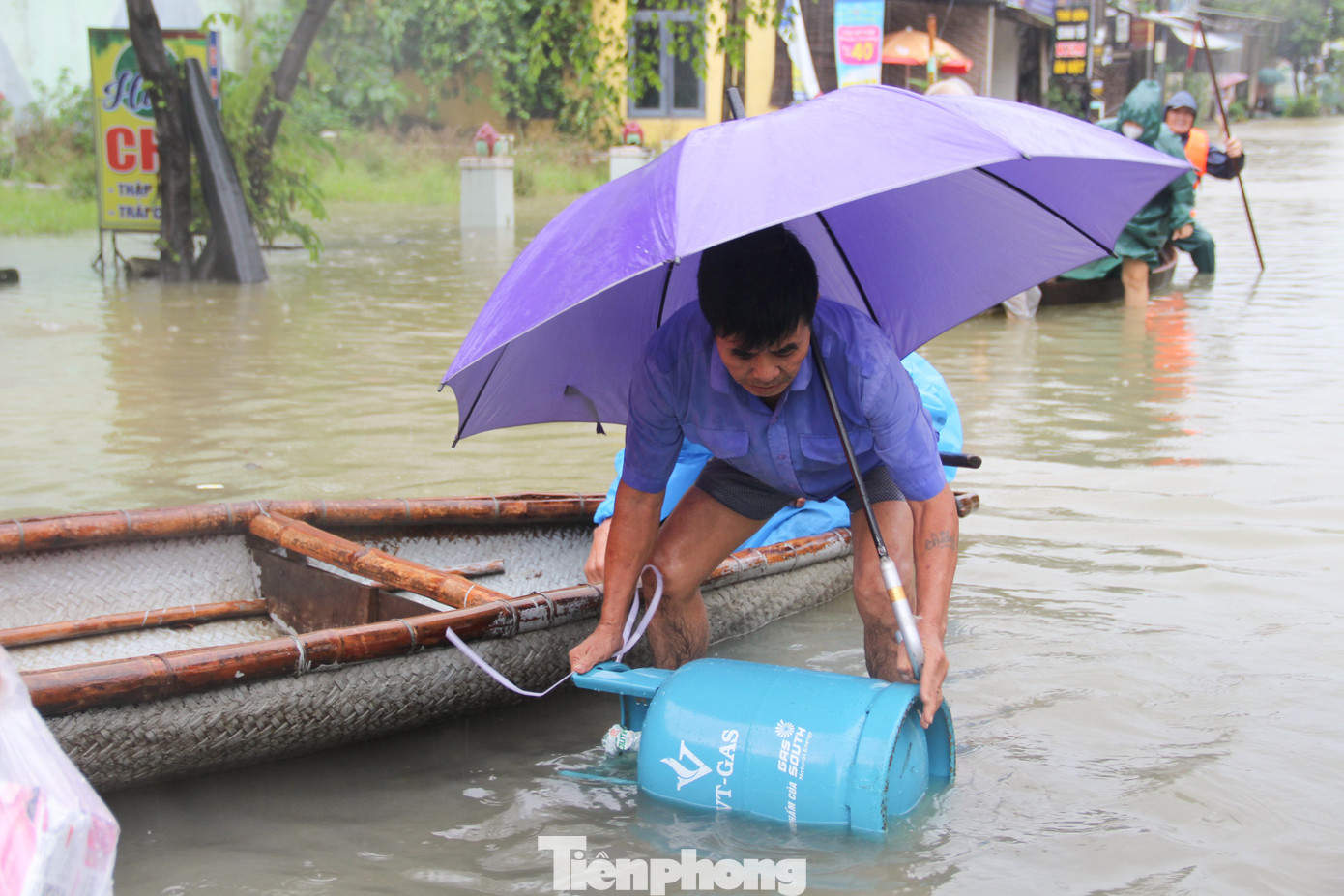 Nhà ở thôn Túy Loan Tây 1, ông Đặng Văn Bông (áo xanh) lội nước hơn 3km để từ nhà ra đến khu vực chợ Cầu Giăng mua sắm. Hiện, nhà ông nước đã ngập đến bụng. Vì sợ đợt lụt kéo dài, ông mua thêm một bình ga dự trữ để nấu nướng.