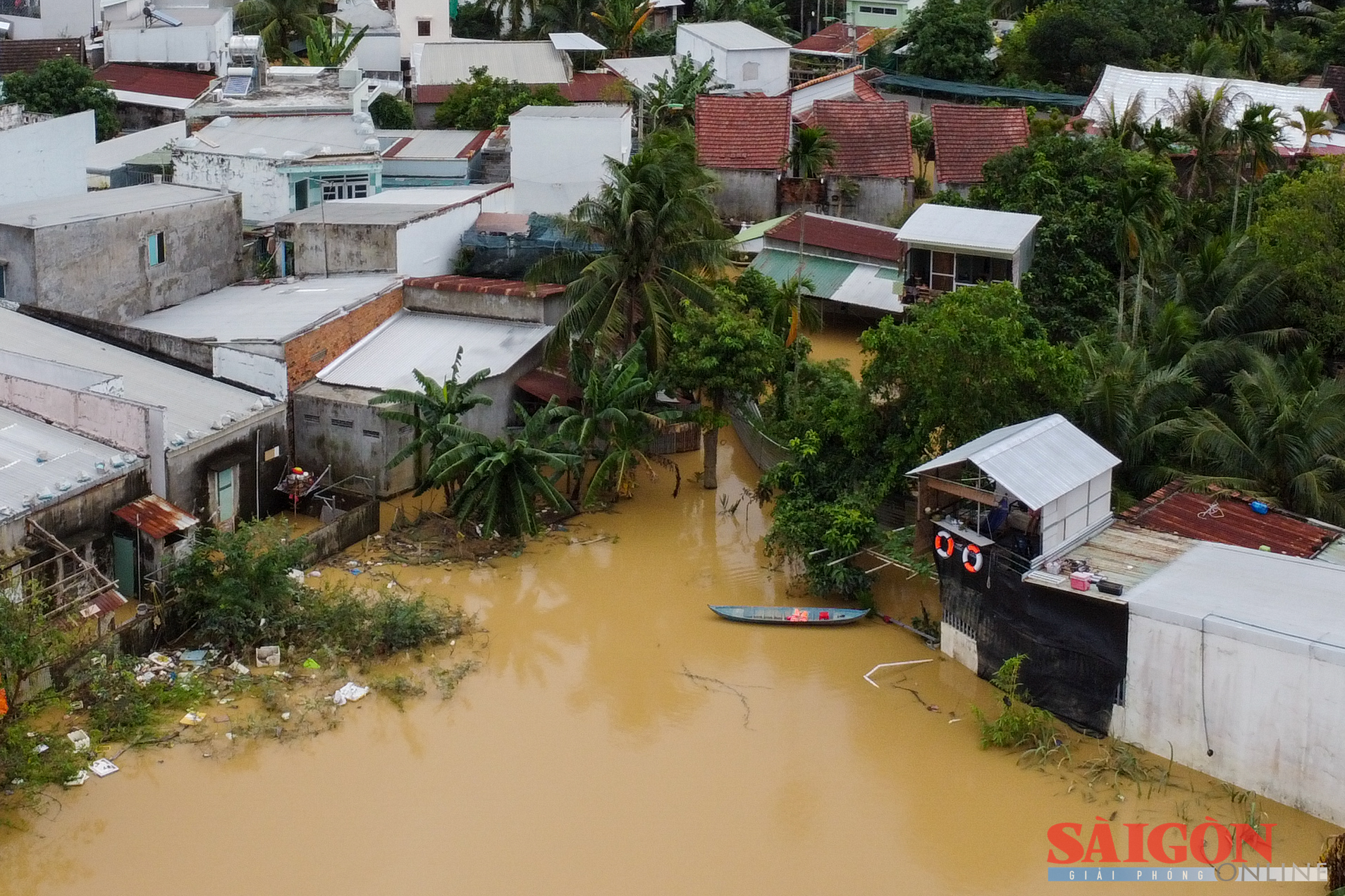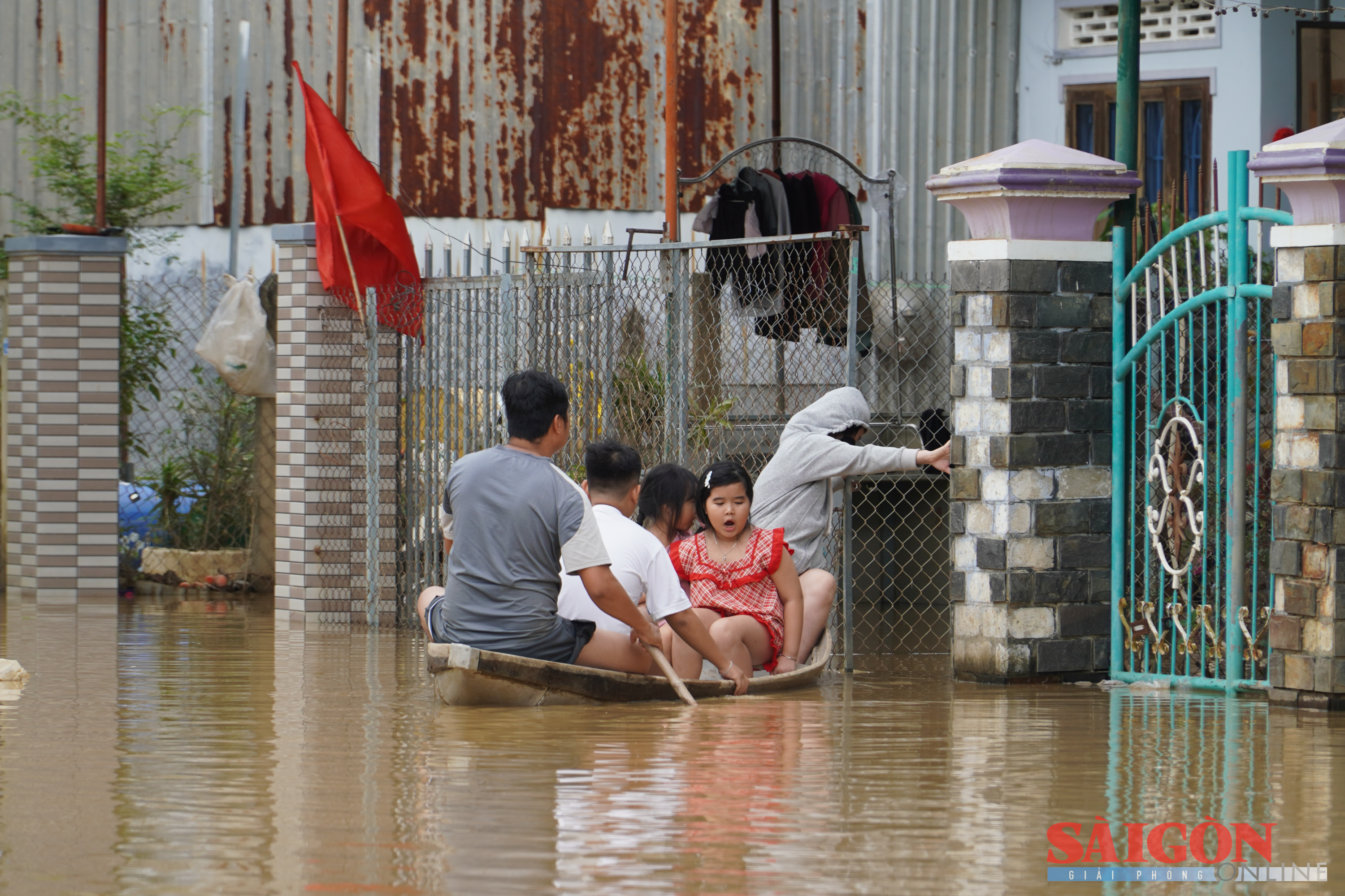Giữa dòng lũ dâng cao, nước đục ngầu, một gia đình ở phường Tây Nha Trang ngồi trên thuyền nhỏ để rời khu vực ngập sâu.