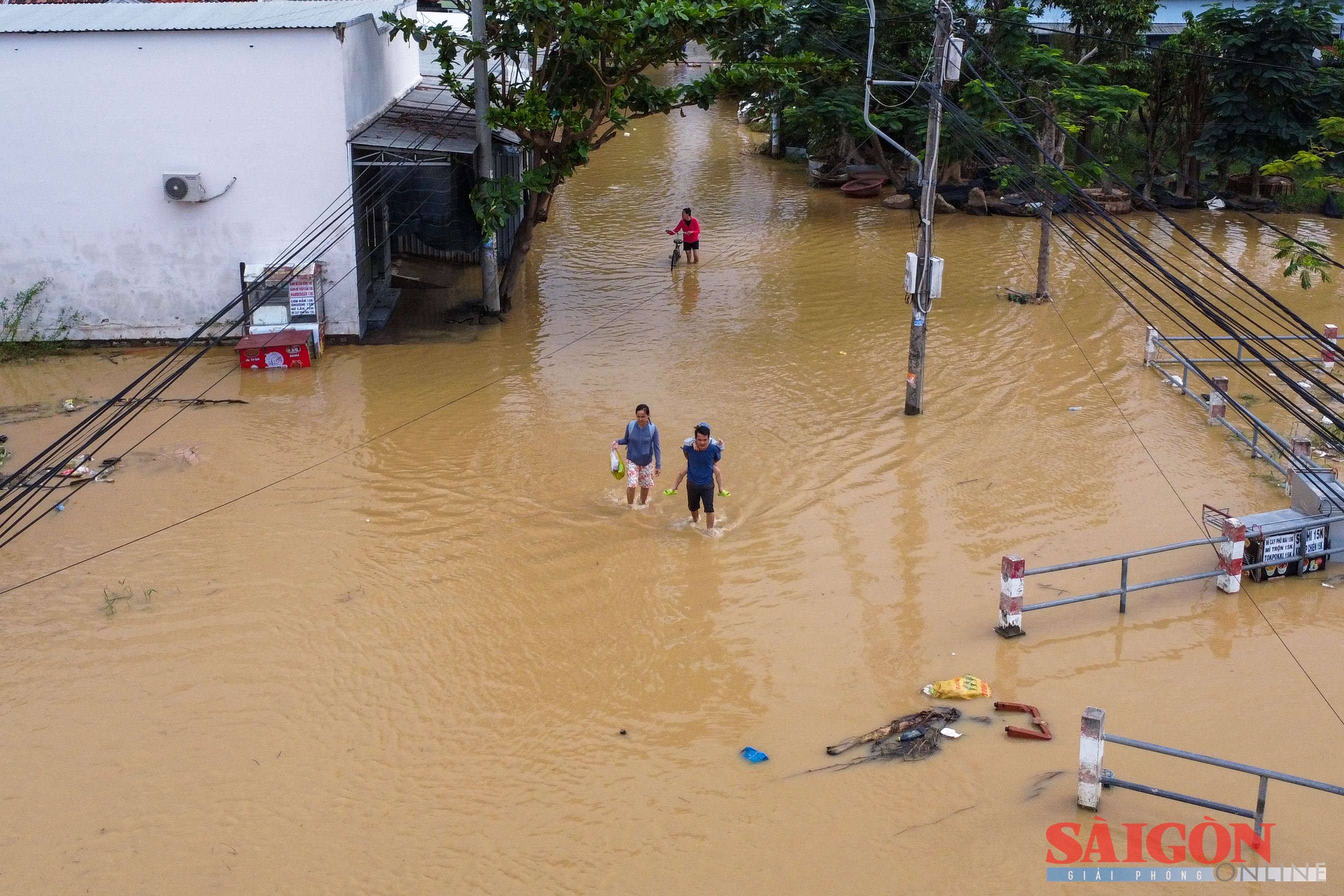 Tại phường Tây Nha Trang, anh Nguyễn Nhật Tân (30 tuổi) nói, trận lụt năm nay là lịch sử. Nửa đêm, nước tràn ngập ngoài ngõ rồi dâng nhanh vào nhà. Anh cùng người thân dựng giàn giáo, khuôn đồ điện tử, chăn gối, nhu yếu phẩm lên cao.