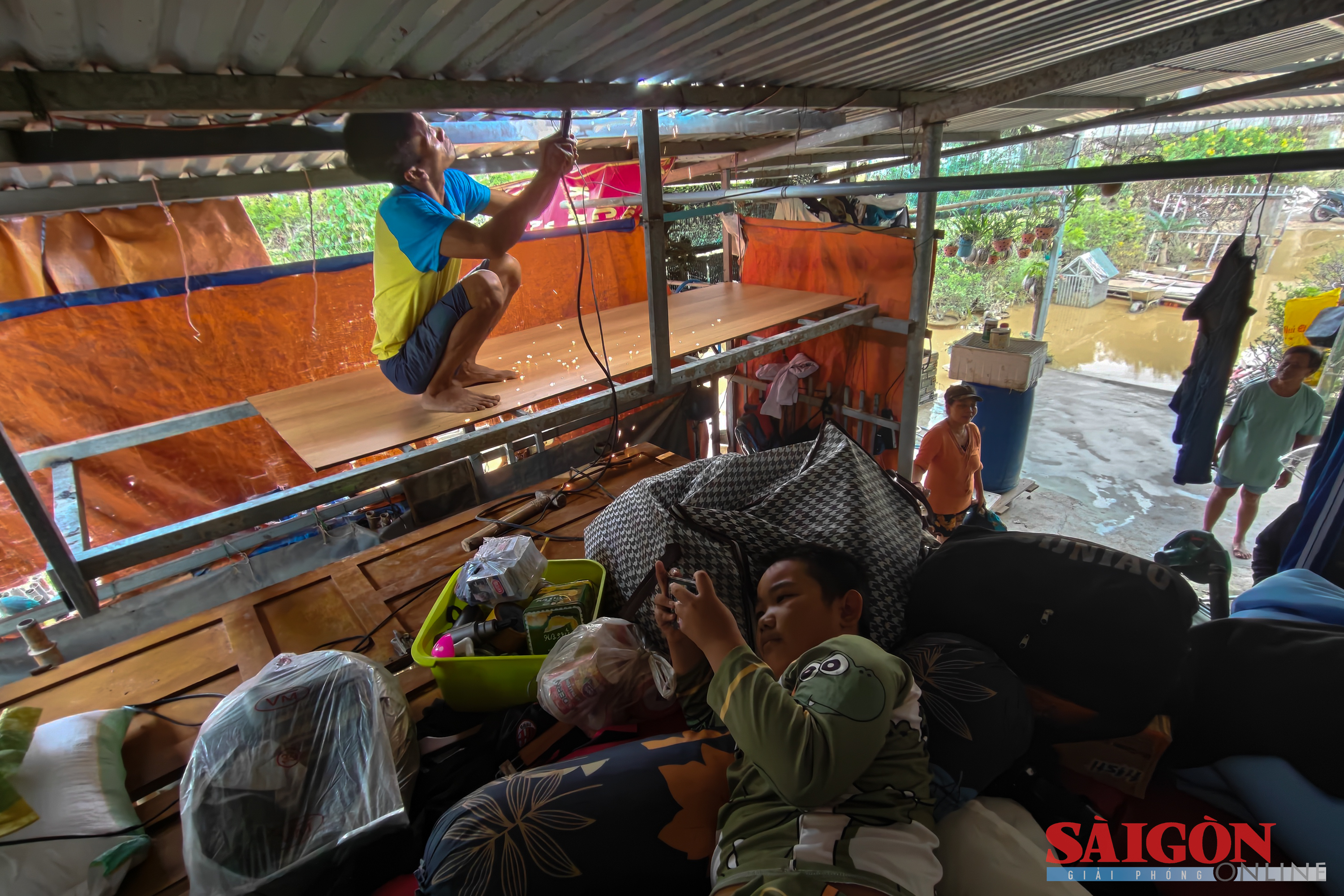 Bà Nguyễn Thị Kim Phụng (74 tuổi), người thân anh Tân, lội nước ra khỏi cổng nhà đã ngập sâu hơn 30cm. Bà mang theo quần áo, ấm điện cho lần chạy lũ thứ tư trong vòng nửa tháng. Trận lũ hồi giữa tháng 11, đại gia đình 22 người nhà bà Phụng cùng chen chúc trên giàn giáo rồi mới sơ tán. Nước lũ ngập gần 2m, trở thành nỗi ám ảnh. Khi nghe dự báo tiếp tục có mưa lớn, khả năng lũ quay lại, gia đình chủ động rời nhà.