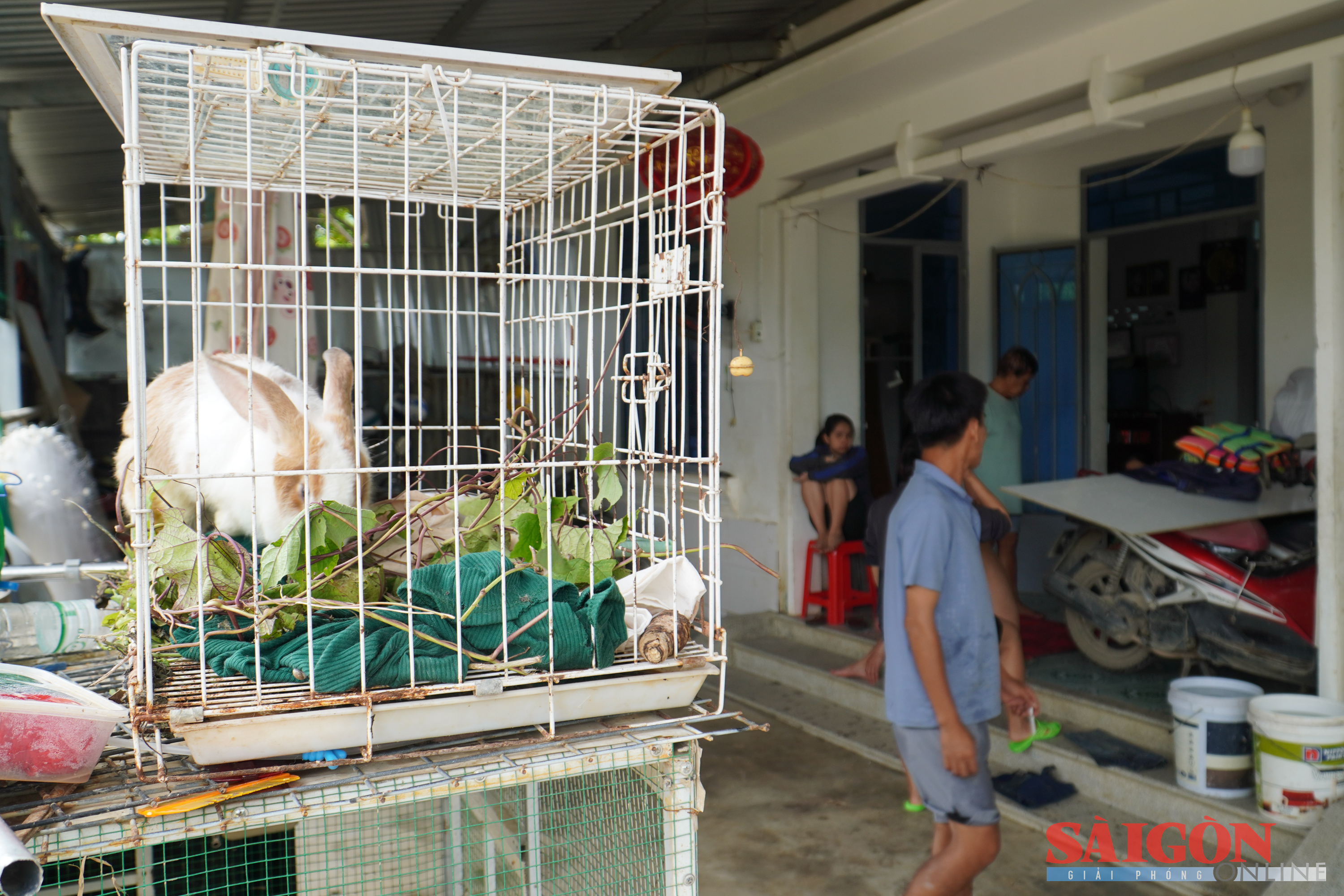 Sợ nước ngập sâu, anh Tân cũng kê cao chuồng thỏ, chuẩn bị sẵn sàng thức ăn, nước uống cho vật nuôi.